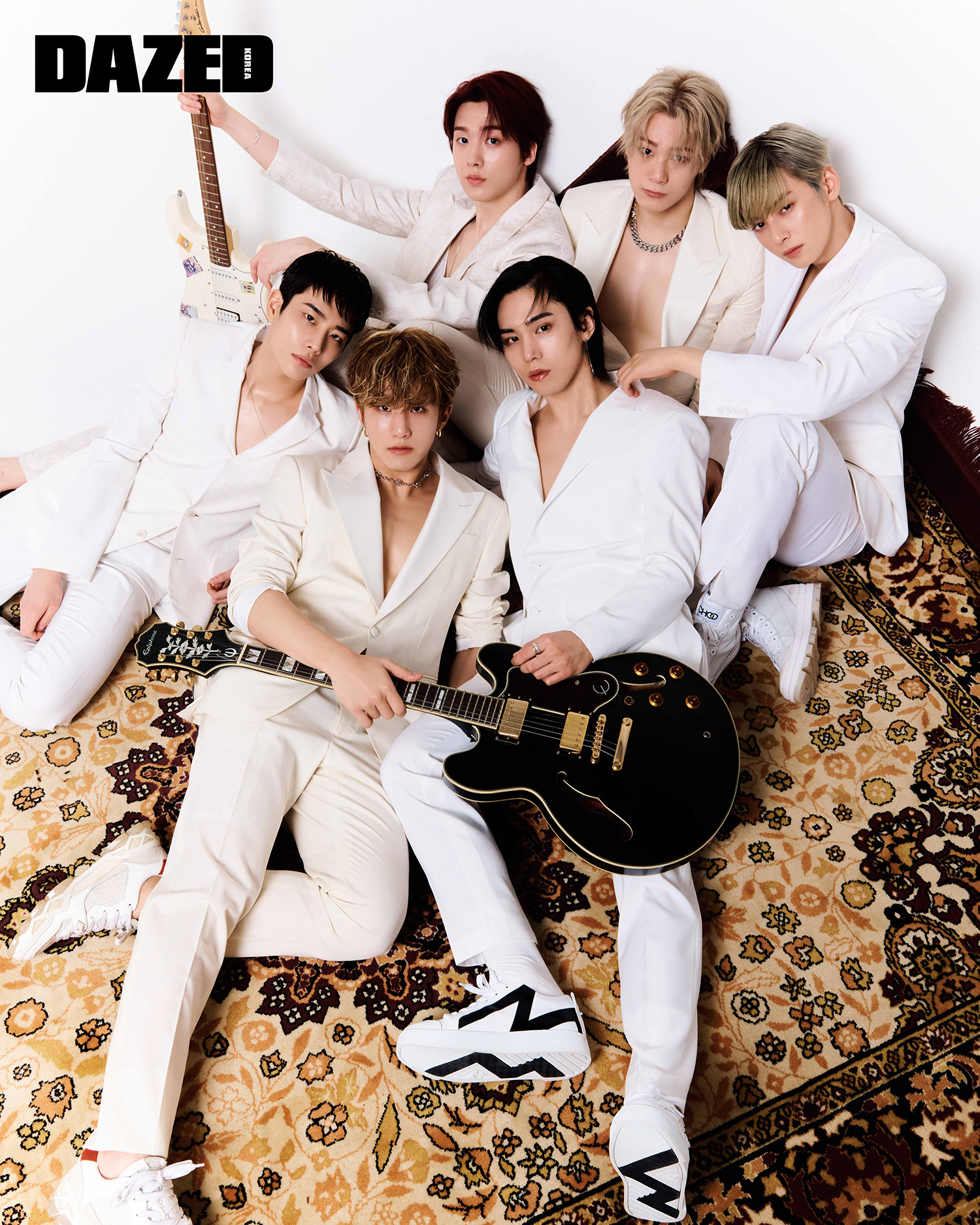 MJ가 입은 재킷과 팬츠는 스타일리스트의 것. 산하가 입은 재킷과 팬츠는 생 로랑 by 안토니 바카렐로(Saint Laurent by Anthony Vaccarello). 문빈이 입은 재킷과 팬츠는 살바토레 페라가모(Salvatore Ferragamo), 네크리스는 루이 비통(Louis Vuitton). 은우가 입은 재킷과 팬츠는 루이 비통(Louis Vuitton), 스니커즈는 지미추(Jimmy Choo). 라키가 입은 재킷과 팬츠, 스니커즈는 모두 골든구스(Golden Goose), 이어링은 베루툼(Verutum). 진진이 입은 재킷과 팬츠, 스니커즈는 모두 지미추(Jimmy Choo), 이어링과 네크리스는 모두 일레란느(Ille Lan).