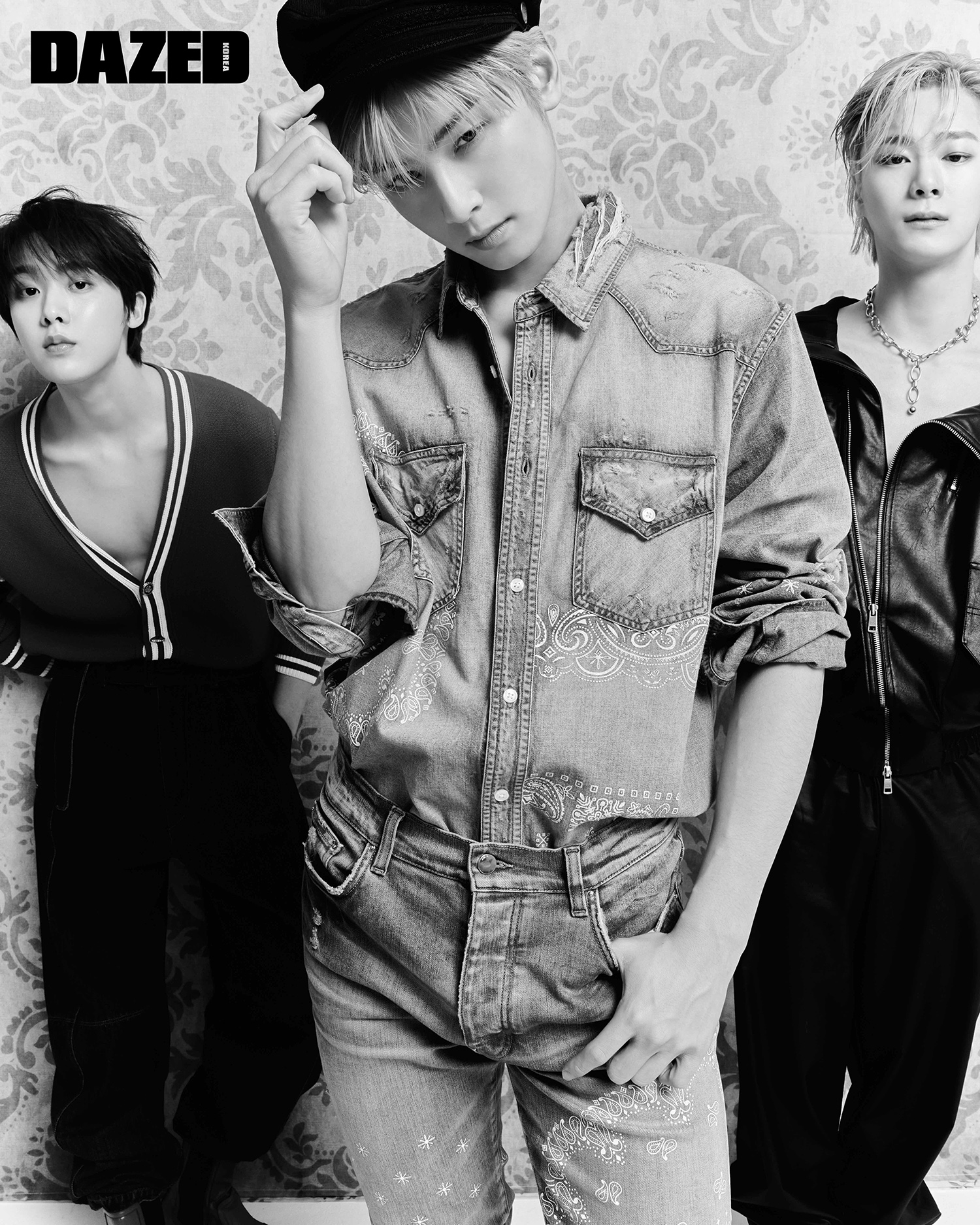 산하가 입은 카디건은 골든구스(Golden Goose), 팬츠는 누마레(Nouvmaree). 은우가 입은 데님 셔츠와 팬츠는 아미리 by 무이(Amiri by Mue), 해트는 스타일리스트의 것. 문빈이 입은 슬리브리스 재킷은 럭키마르쉐(Lucky Marché), 팬츠는 라프 시몬스 by 지스트리트 494 옴므(Raf Simons by G. Street Homme), 네크리스는 일레란느(Ille Lan).