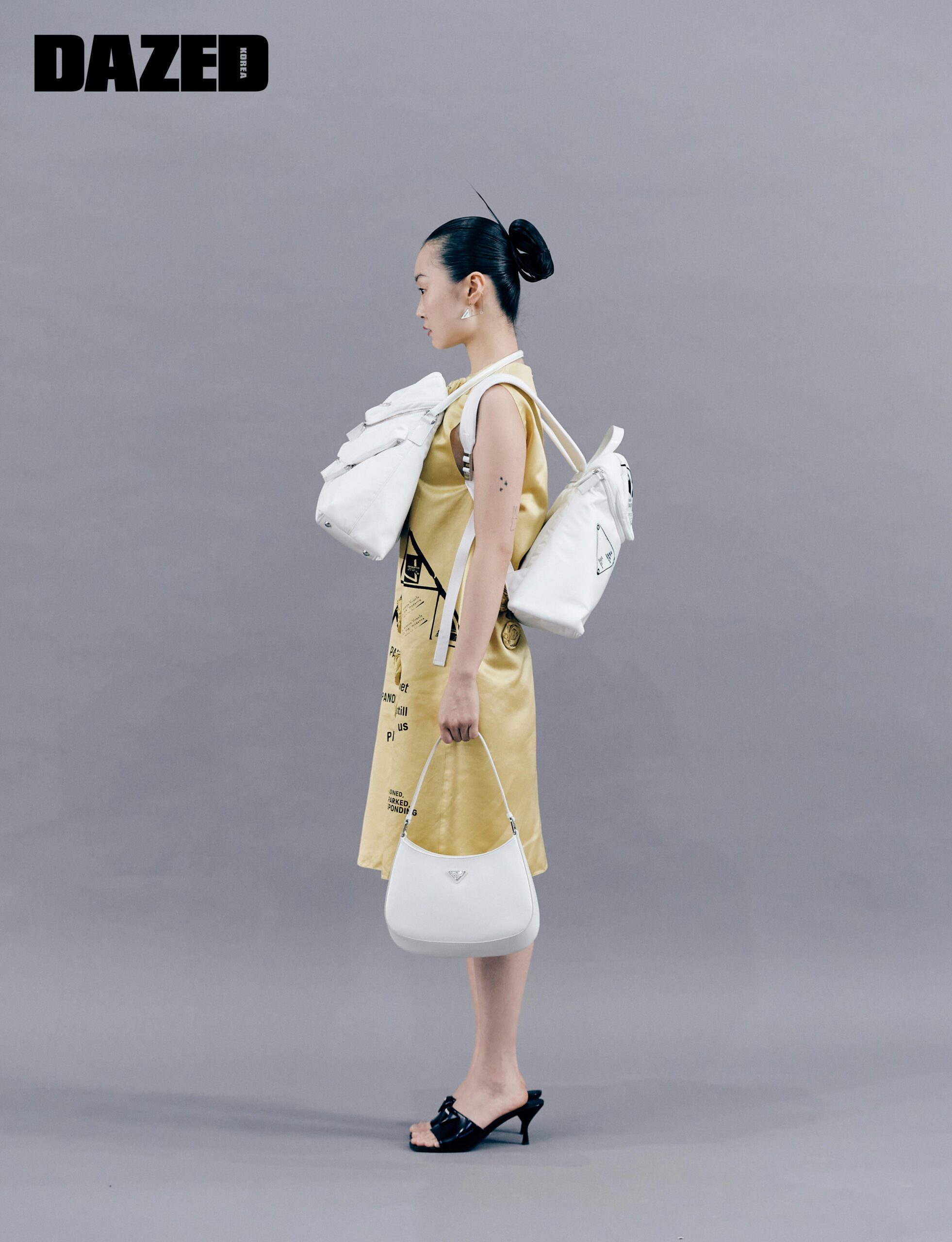프린트 디테일의 뒤셰스 드레스와 화이트 로고 이어링, 시그노 레더 트리밍의 나일론 백팩, 시그노 프린트의 나일론 301 백팩, 화이트 컬러 스몰 클레오 백, 로고 디테일의 미들힐 슬라이드는 모두 프라다(Prada).