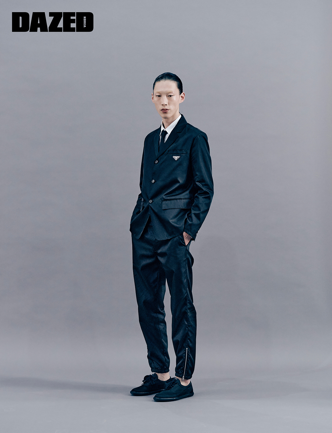 나일론 싱글브레스트 재킷과 코튼 셔츠, 리나일론 팬츠, 리나일론 개버딘 타이, 나일론 레이스업 스니커즈는 모두 프라다(Prada).
