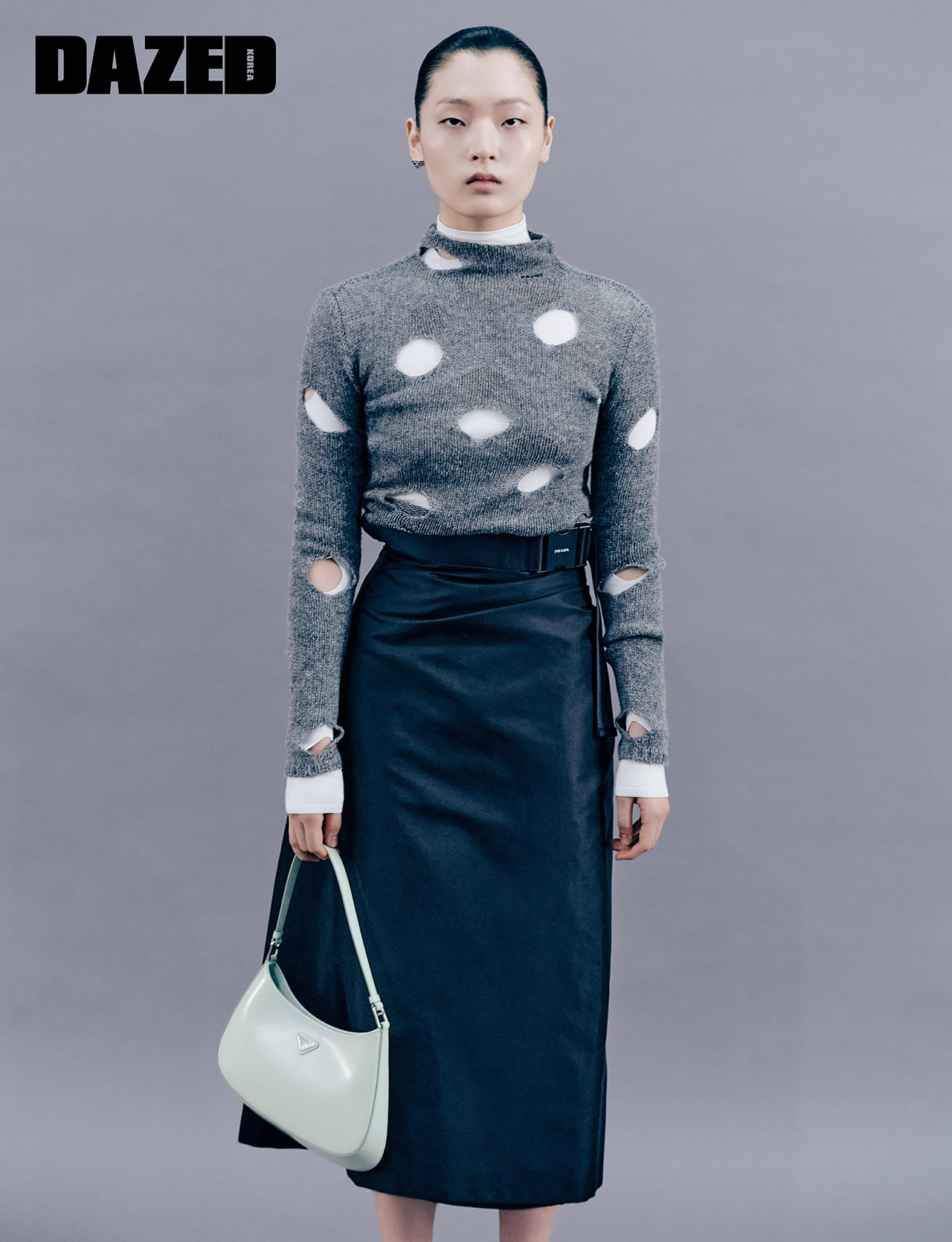 홀 디테일의 그레이 비스코스 터틀넥 스웨터와 화이트 오픈워크 비스코스 스웨터, 리나일론 295 개버딘 스커트, 로고 모티브 이어링, 아쿠아 컬러 스몰 클레오 백은 모두 프라다(Prada).