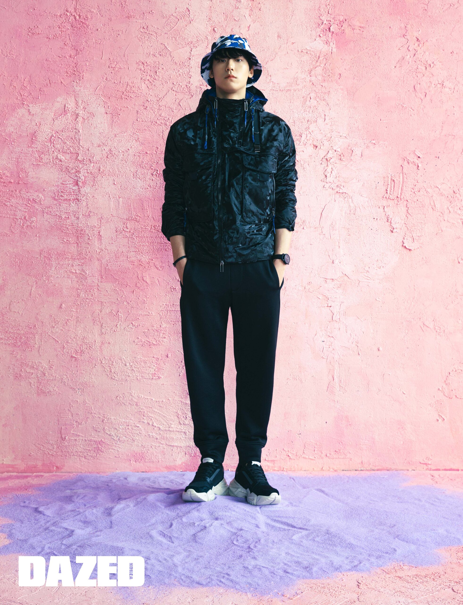 카무플라주 패턴이 돋보이는 후드 퀼티드 재킷, 포켓 디테일과 뒷면 로고 패치가 특징인 조거 팬츠, 화이트 솔 포인트의 스웨이드 스니커즈, 카무플라주 패턴과 로고 디테일이 특징인 버킷 해트, 건메탈 레더 브레이슬릿, 아이코닉한 이글 로고를 스켈레톤 방식으로 디자인한 올 블랙 오토매틱 워치는 모두 엠포리오 아르마니(Emporio Armani).