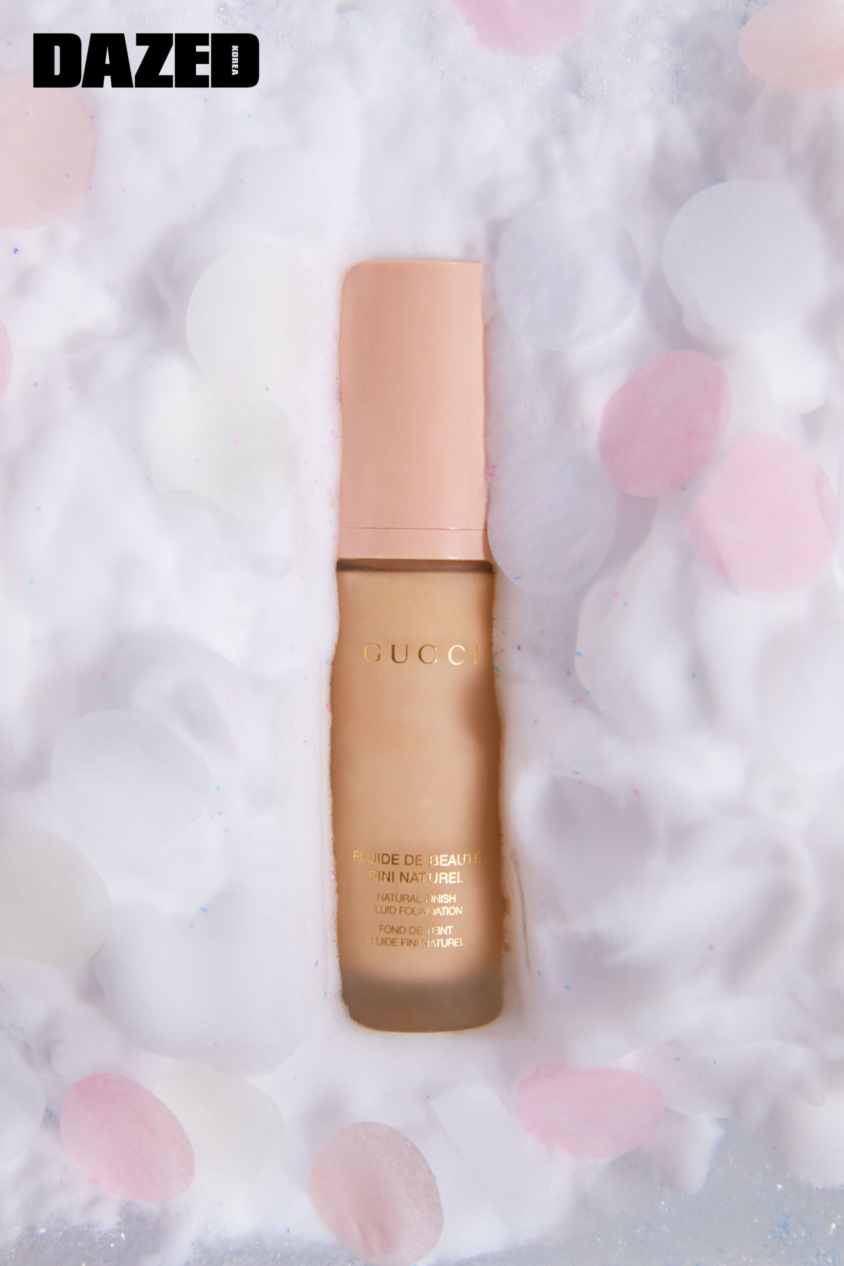 아금빛 구찌 로고를 레터링한 말간 유리 보틀과 페일 핑크 컬러 뚜껑의 조화가 수줍은 소녀의 화장대를 떠올리게 하는 구찌 뷰티의 첫 파운데이션.