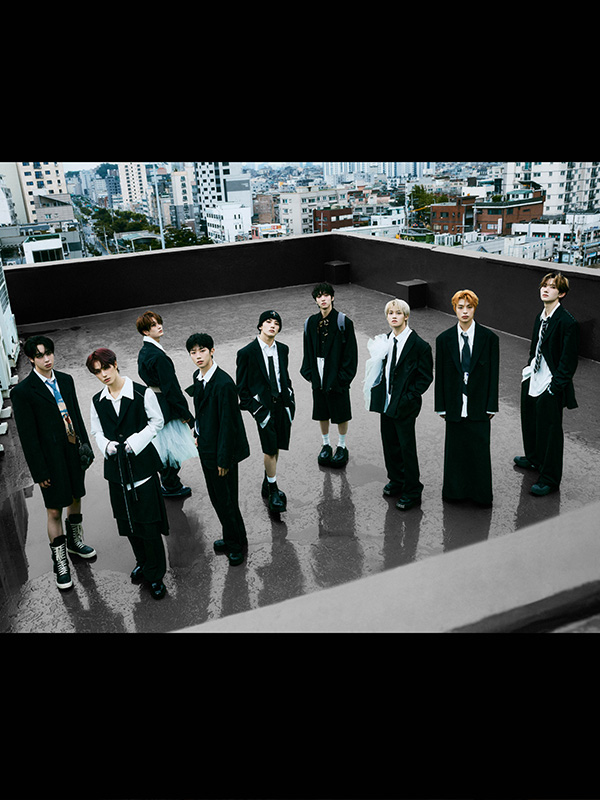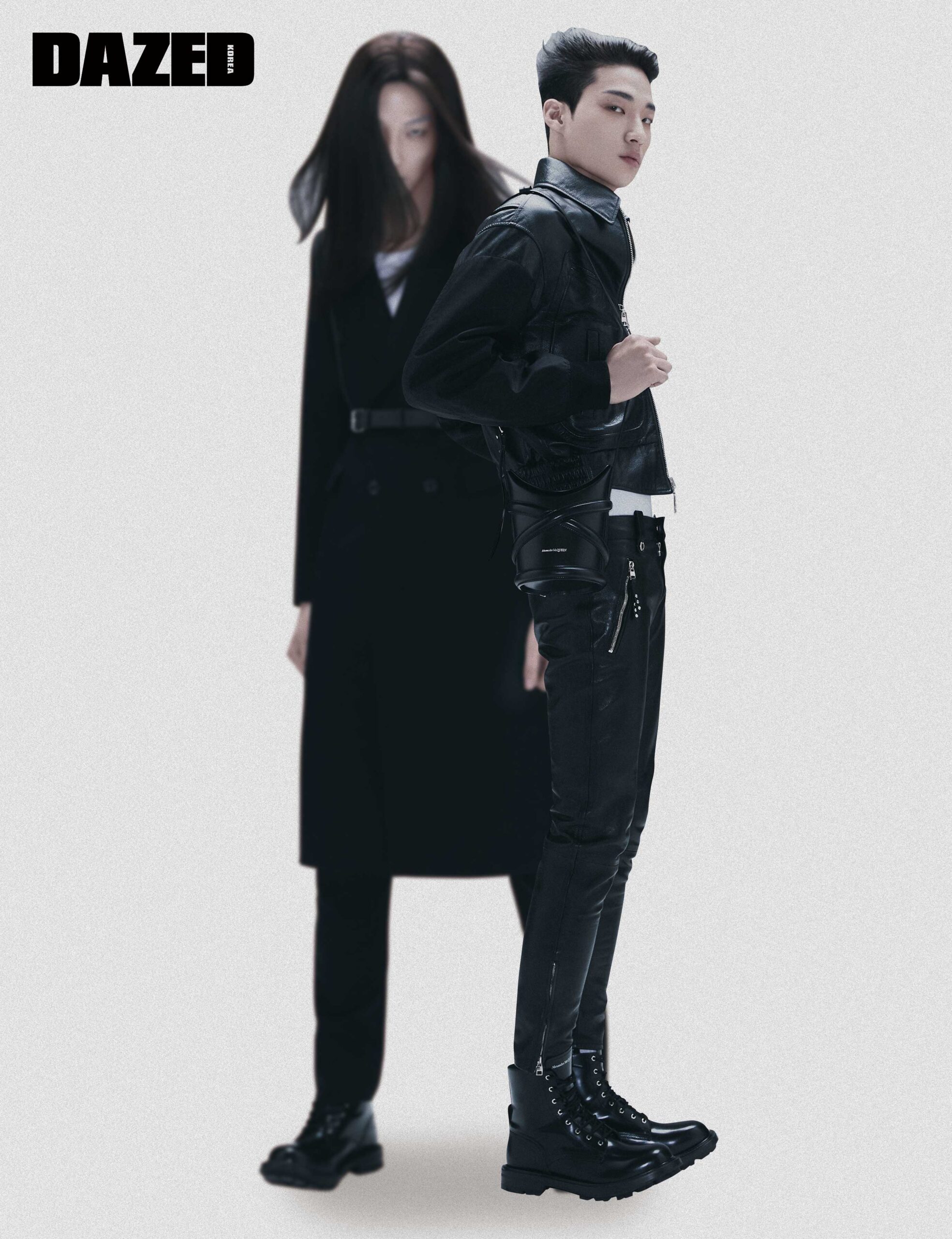 긴 머리의 재형이 입은 더블브레스트 코트와 슬리브리스 톱, 스키니 팬츠, 레이스업 부츠, 하네스 베스트는 모두 알렉산더 맥퀸(Alexander McQueen). 짧은 머리의 재형이 입은 레더 재킷과 팬츠, 슬리브리스 톱, 레이스업 부츠, 알렉산더 맥퀸의 아이콘인 하네스 실루엣을 반영한 커브 백은 모두 알렉산더 맥퀸(Alexander McQueen).