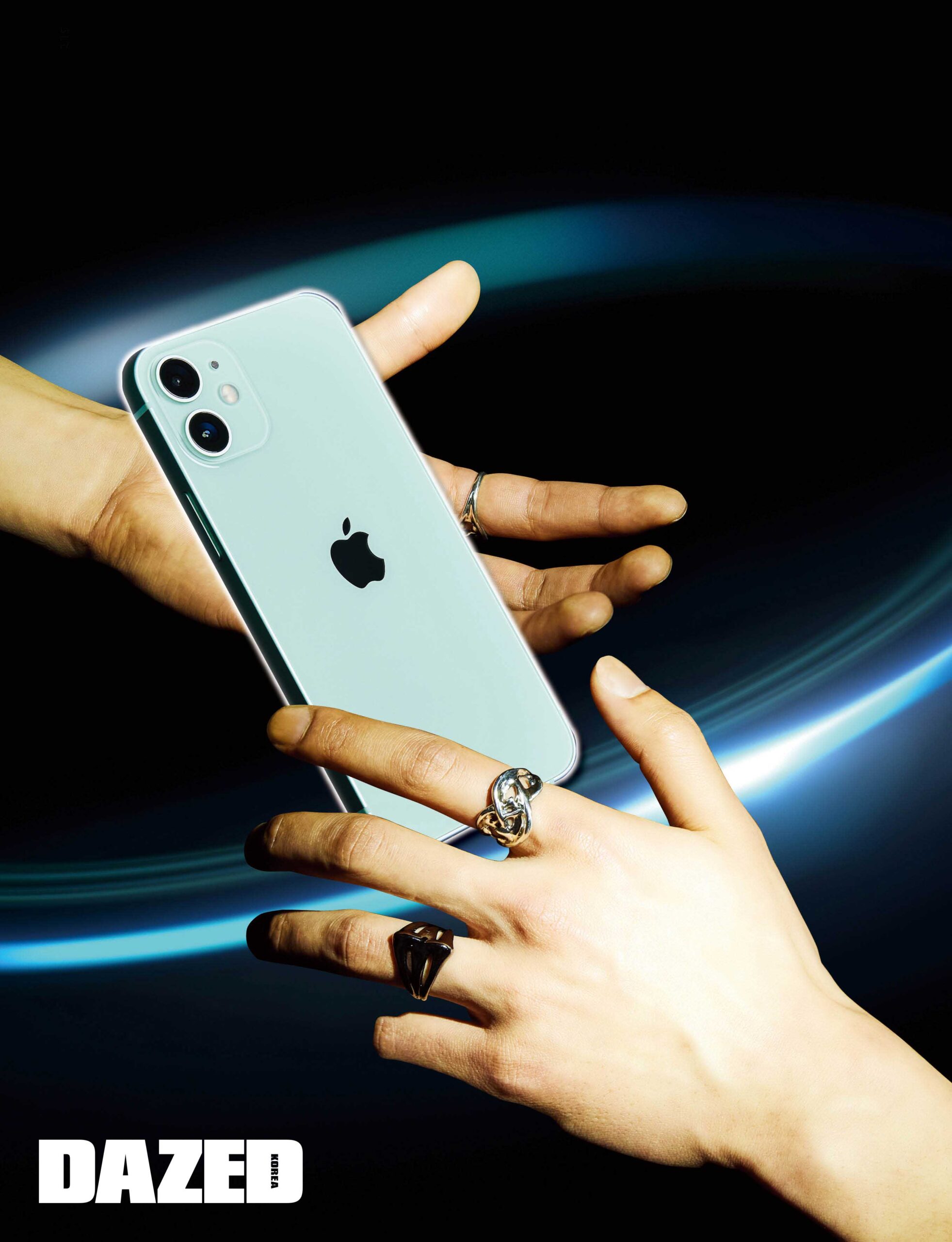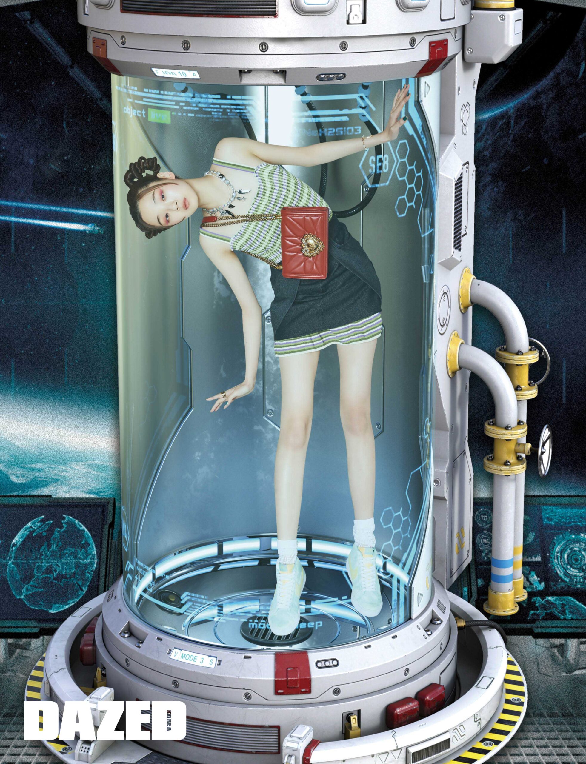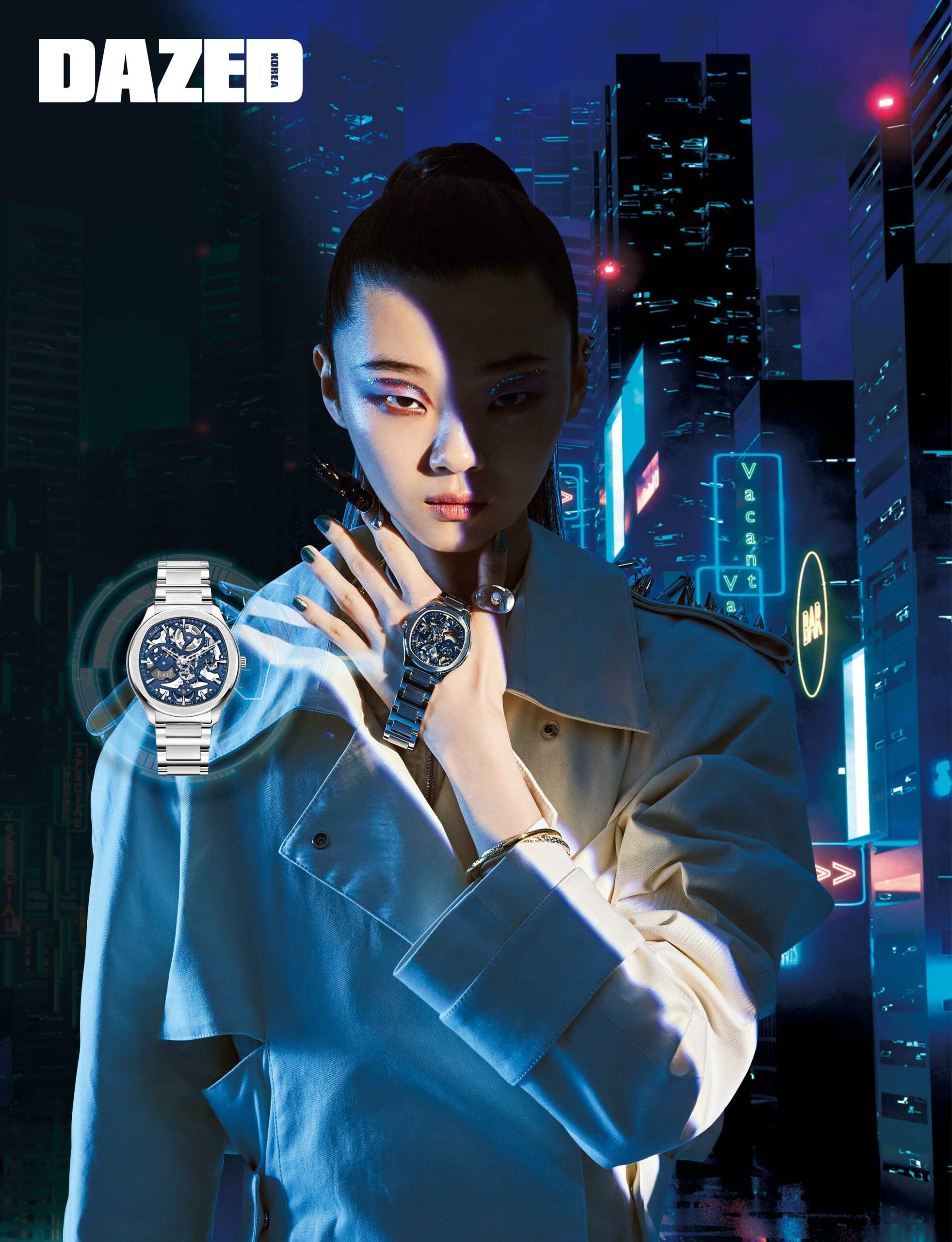 웨이스트 컷 트렌치코트는 지방시(Givenchy), 스테인리스 워치는 피아제(Piaget), 로봇 모티브 네일 웨어와 투명한 링은 허자보이에이씨씨(Hurjaboyacc), 골드 브레이슬릿과 실버 브레이슬릿은 셀뮤트(Cellmute).