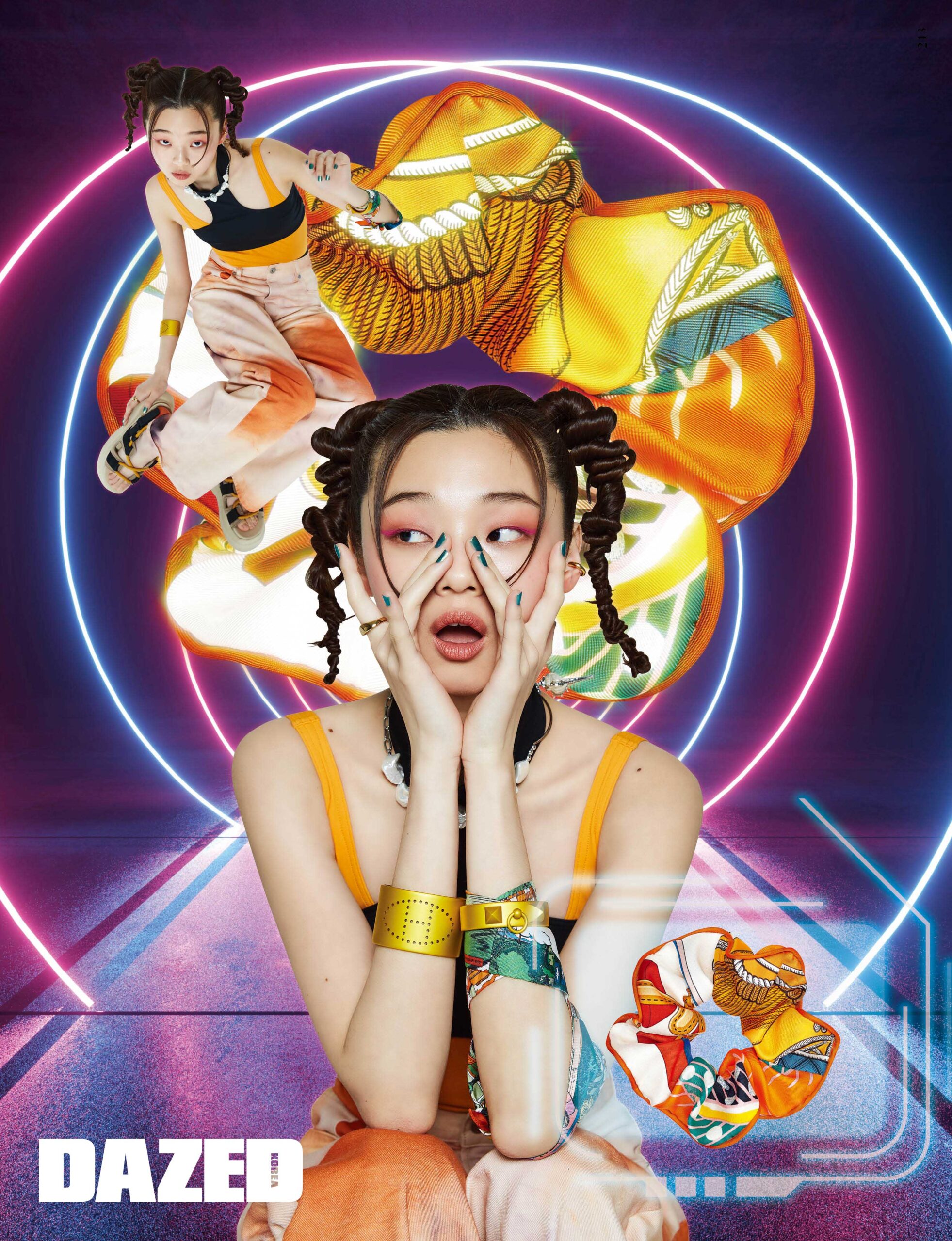 블랙 홀터넥 스윔웨어와 이너로 입은 오렌지 스윔웨어, 프린트 실크 스크런치, 알루미늄 선셋 브레이슬릿, 링과 스터드 디테일 알루미늄 선셋 브레이슬릿, 팔에 연출한 트윌리는 모두 에르메스(Hermès), 날염 프린트 팬츠와 스트랩 슈즈는 에이치앤엠(H&M), 골드 이어커프는 셀뮤트(Cellmute), 펄 네크리스는 허자보이에이씨씨(Hurjaboyacc), 골드 링은 포트레이트 리포트(Portrait Report).