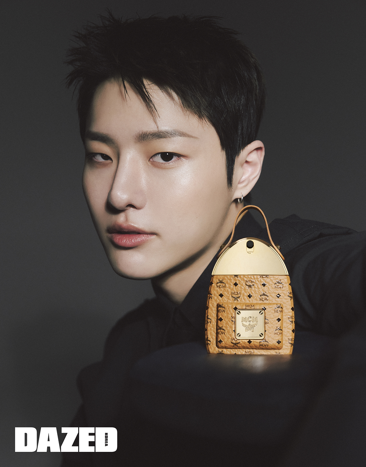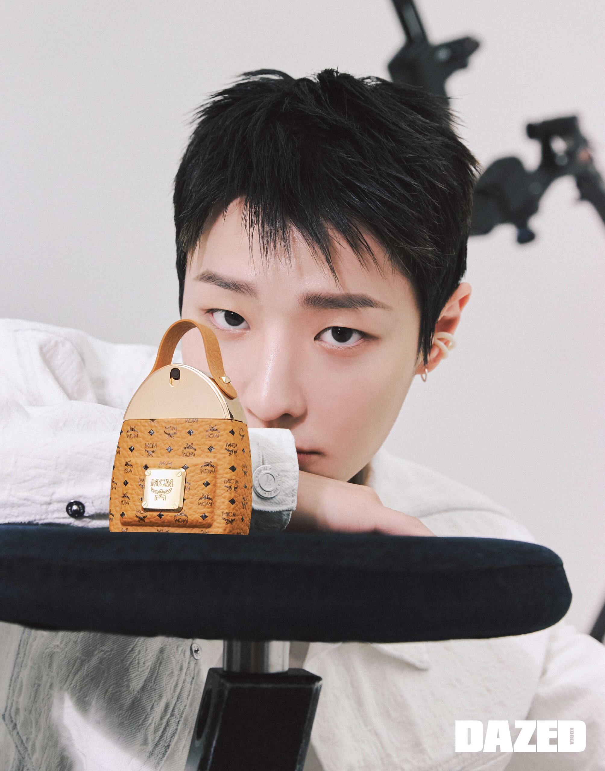 MCM 모노그램 화이트 데님 재킷은 엠씨엠(MCM), 이어커프는 누아보(Nuavo), 실버 이어링은 스타일리스트의 것.