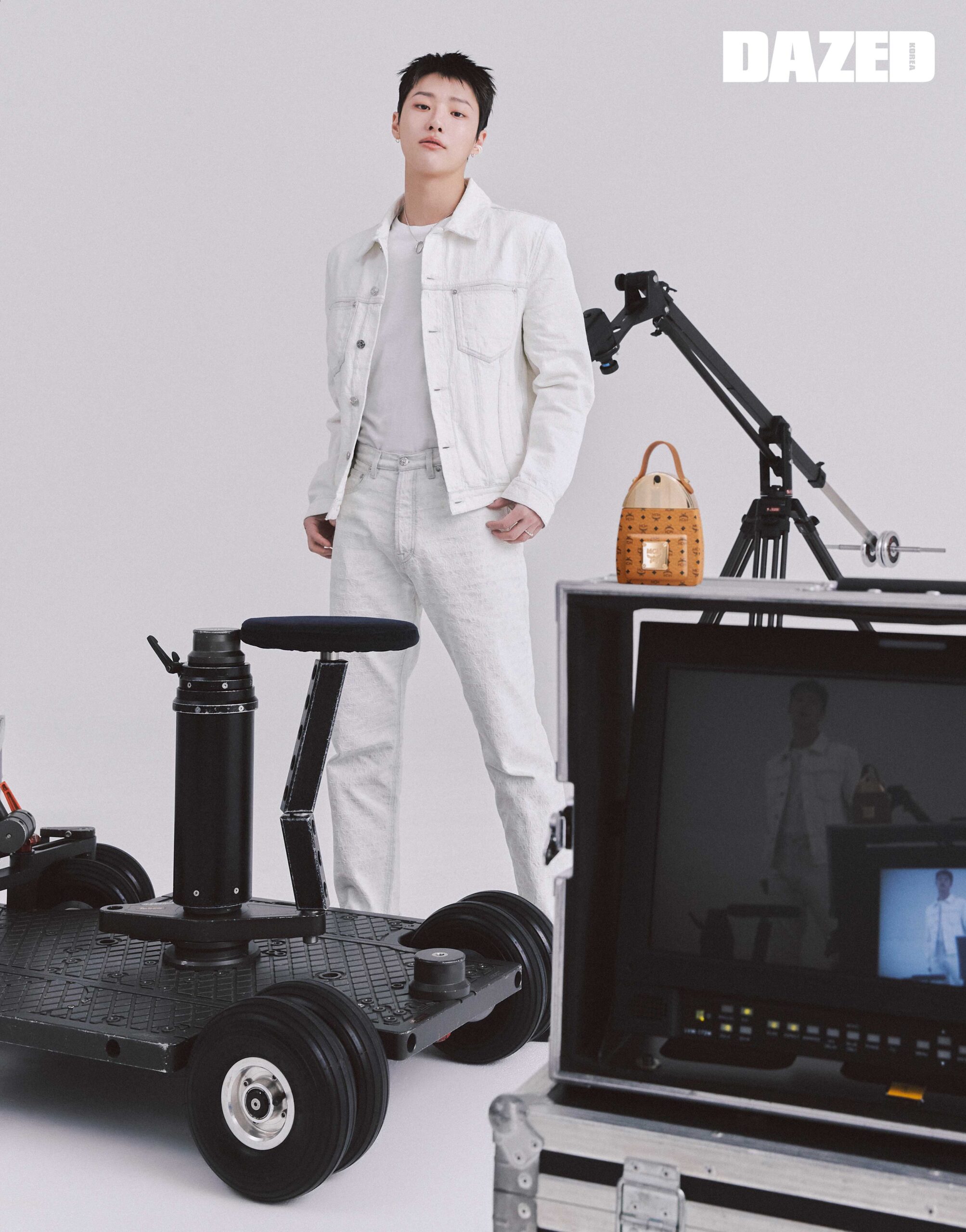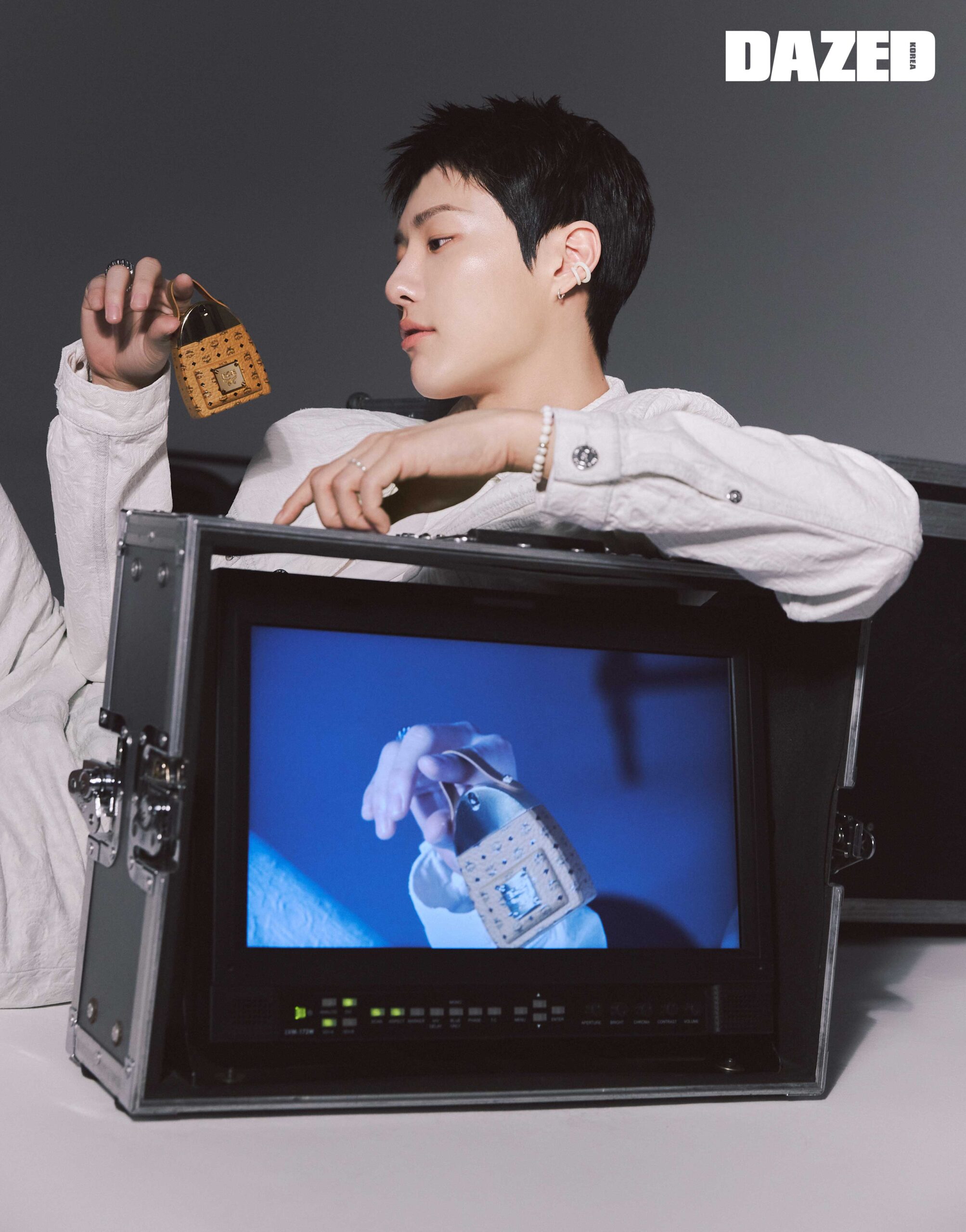 MCM 모노그램 화이트 데님 재킷과 팬츠는 엠씨엠(MCM), 이어커프는 누아보(Nuavo), 왼손에 착용한 진주 링은 러브미몬스터(Love me, Monster), 화이트 브라켓은 아프로즈(Aphrose), 오른손에 착용한 실버 링은 링키 래버토리(Linky Laboratory), 실버 이어링은 스타일리스트의 것.