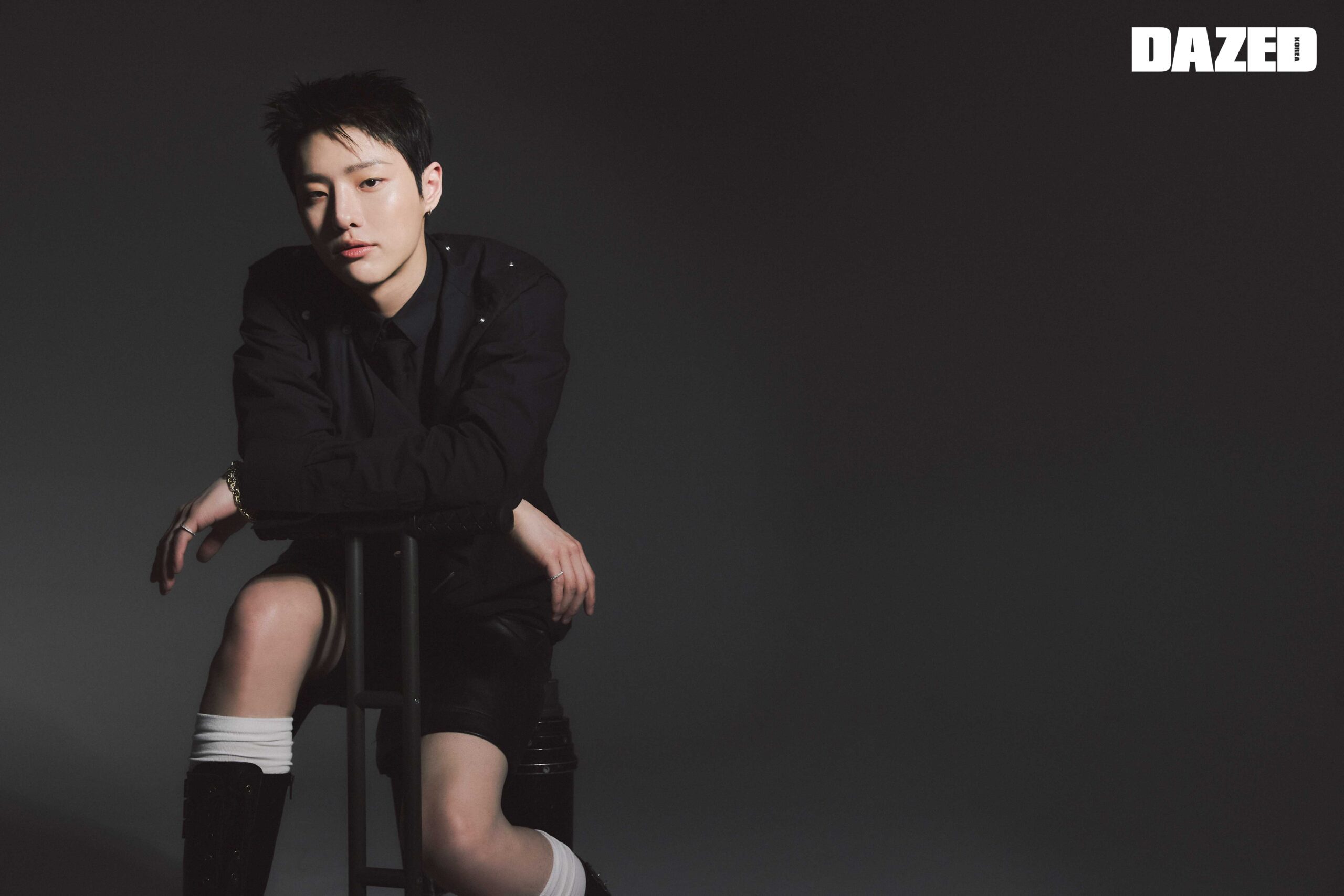 블랙 셔츠는 엘리엇 에밀(Heliot Emil), 타이는 1017 ALYX 9SM, 레더 쇼츠는 이에스씨 스튜디오(ESC Studio), 실버 이어링과 링, 매듭 디테일 브레이슬릿은 모두 아프로즈(Aphrose), 니삭스와 롱 레이스업 부츠는 스타일리스트의 것.