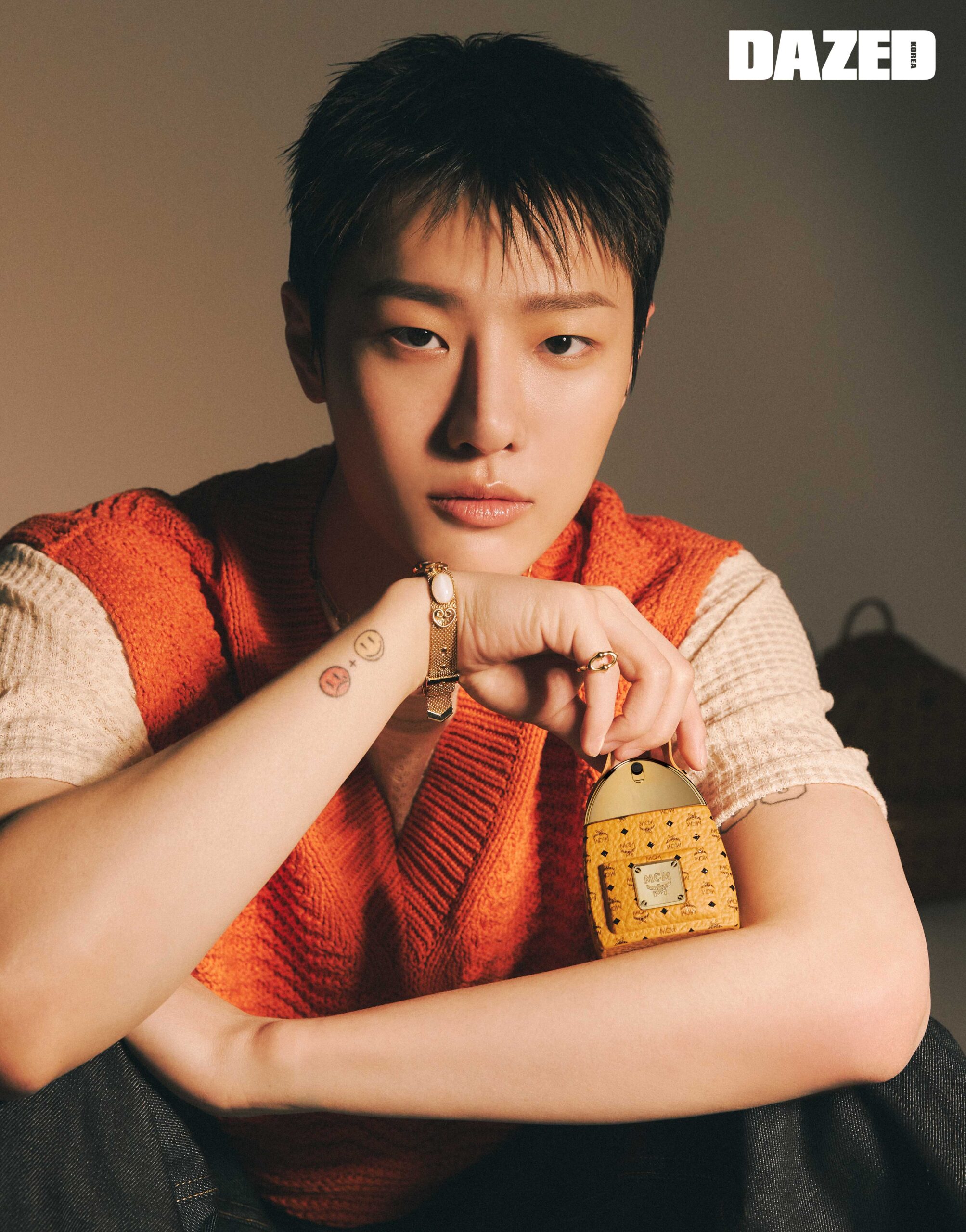 오렌지 컬러 니트 베스트는 베일가(Veilga), 이너로 매치한 니트 티셔츠는 웨이즈(Waze), 와이드 데님 팬츠는 레이 by 매치스패션(Raey by Matchesfashion), 골드 펜던트 브라켓은 샤넬(Chanel), 옐로 골드 라운드 링은 링키 래버토리(Linky Laboratory).