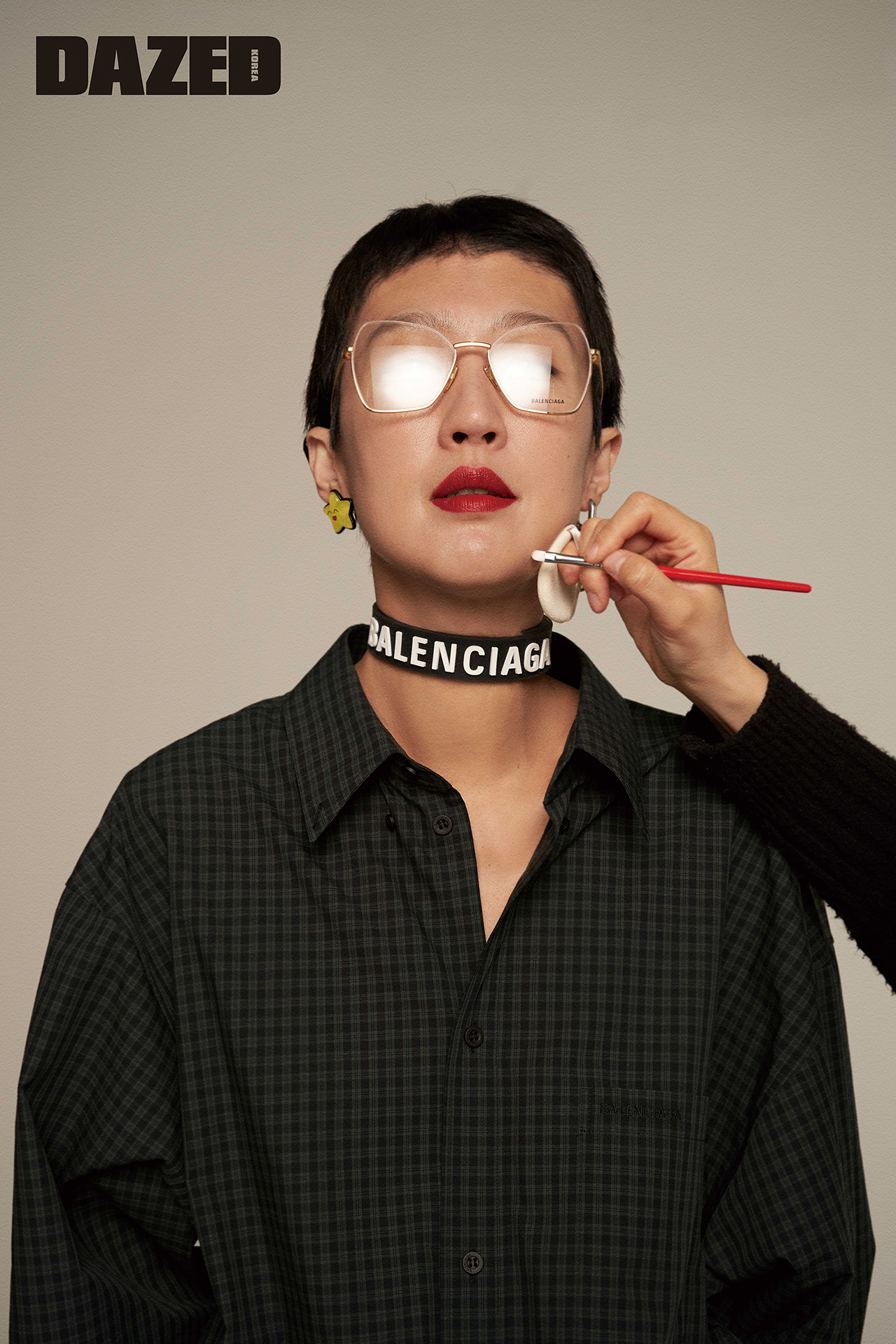 비대칭 셔츠와 러버 태그 초커, 안경, 이어링은 모두 발렌시아가(Balenciaga).