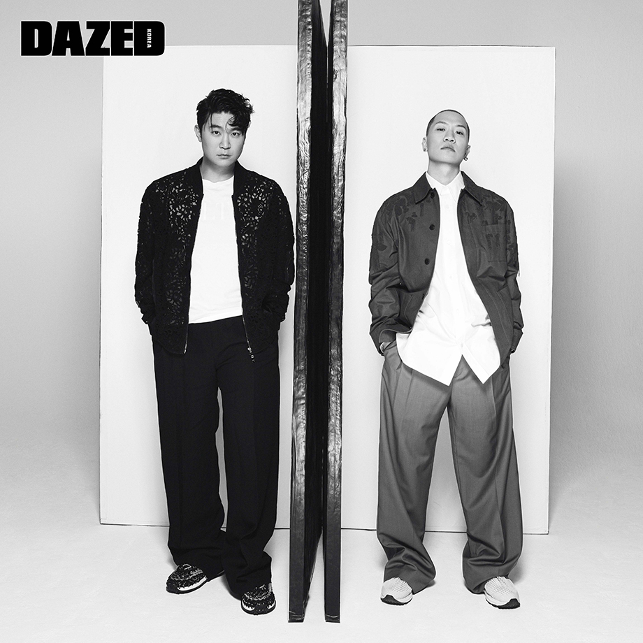 최자가 입은 재킷과 티셔츠, 팬츠는 모두 발렌티노(Valentino), 스니커즈는 발렌티노 가라바니(Valentino Garavani). 개코가 입은 비즈 디테일 재킷과 셔츠, 팬츠는 모두 발렌티노(Valentino), 슈즈는 아식스 스포츠스타일(ASICS SportStyle).