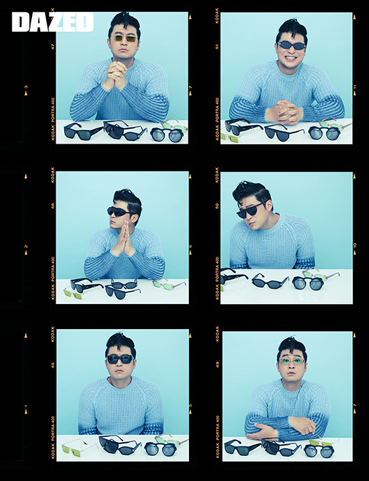 블루 그러데이션 니트 톱은 8 by 육스(8 by YOOX), 선글라스는 왼쪽 위부터 시계 방향으로 젠틀몬스터(Gentlemonster), 젠틀몬스터(Gentlemonster), 엠포리오 아르마니 by 룩소티카(Emporio Armani by Luxottica), 젠틀몬스터(Gentlemonster), 레이밴 by 룩소티카(Ray-Ban by Luxottica), 엠포리오 아르마니 by 룩소티카(Emporio Armani by Luxottica).