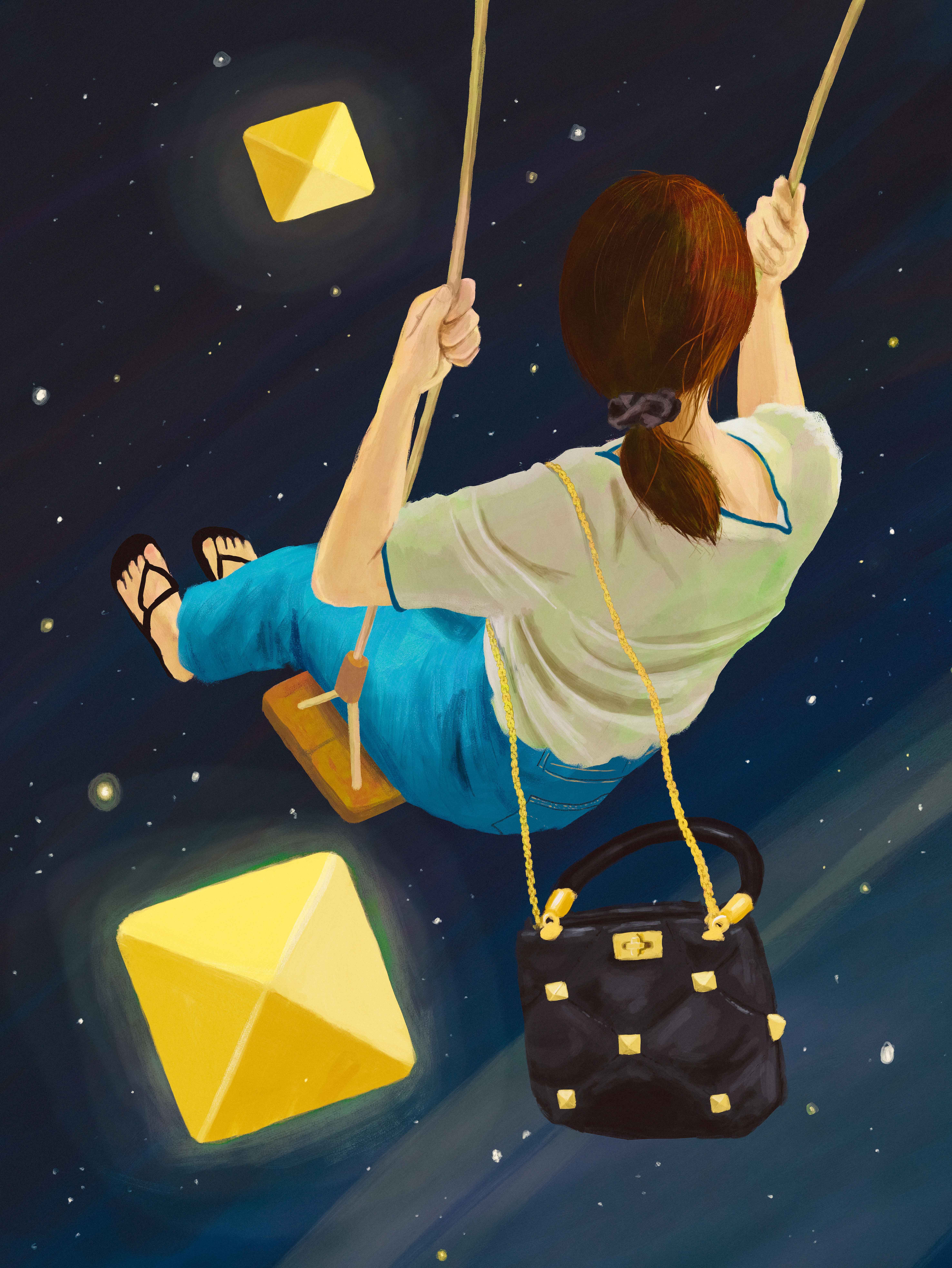 그렇게 탄생한 작품에 관해 설명을 부탁한다. 우주를 배경으로, 스터드 백을 멘 소녀가 그네를 타고 있다.