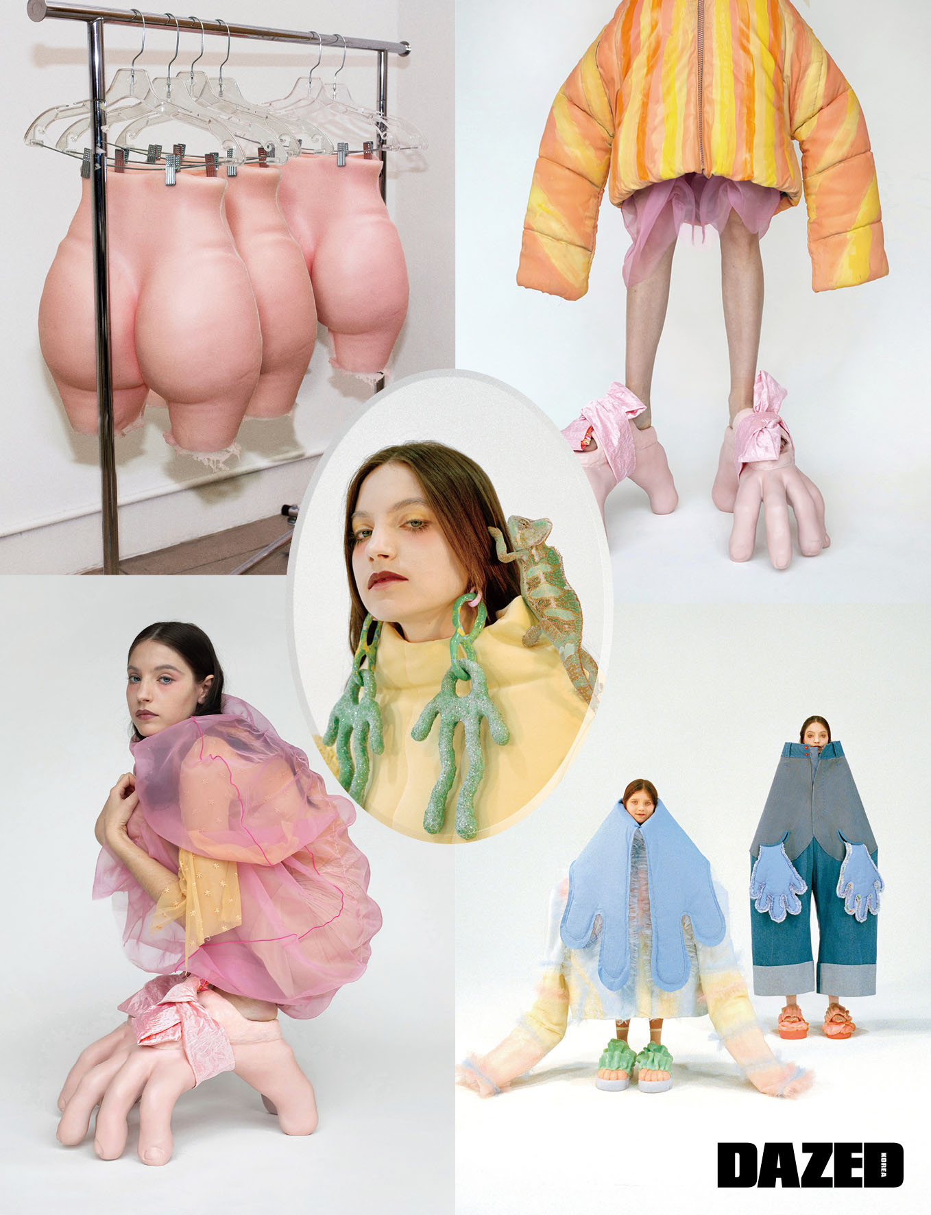 손과 발 형태에서 영감받아 작업을 이어오고 있다. 아기의 발을 거대하게 만든 플랫폼 슈즈 ‘The Fat Baby Shoes’를 시작으로 1년 후 그 연장선 Finger Feet Boots가 탄생했다.