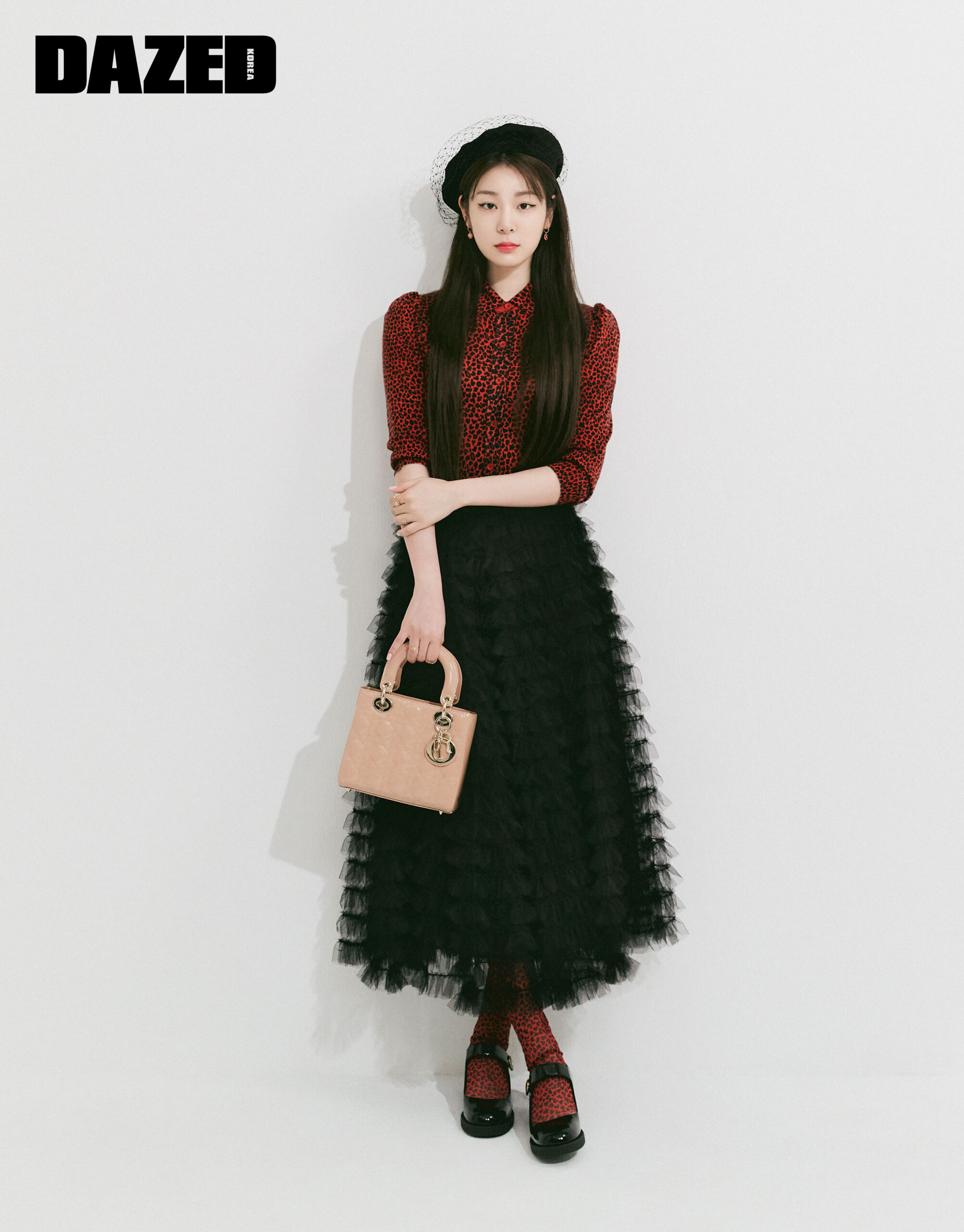 퍼프 슬리브가 돋보이는 레오퍼드 프린트 보디슈트와 블랙 튈 스커트, 페이턴트 카프 스킨 레이디 디올 백, 프린트 반투명 타이츠, 골드 CD 시그너처 장식 블랙 데커레이티브 버튼의 크링클드 카프 스킨 디올 돌 펌프스 힐, 베일을 더한 블랙 래빗 펠트 디올 페르시안 베레는 모두 디올(Dior).