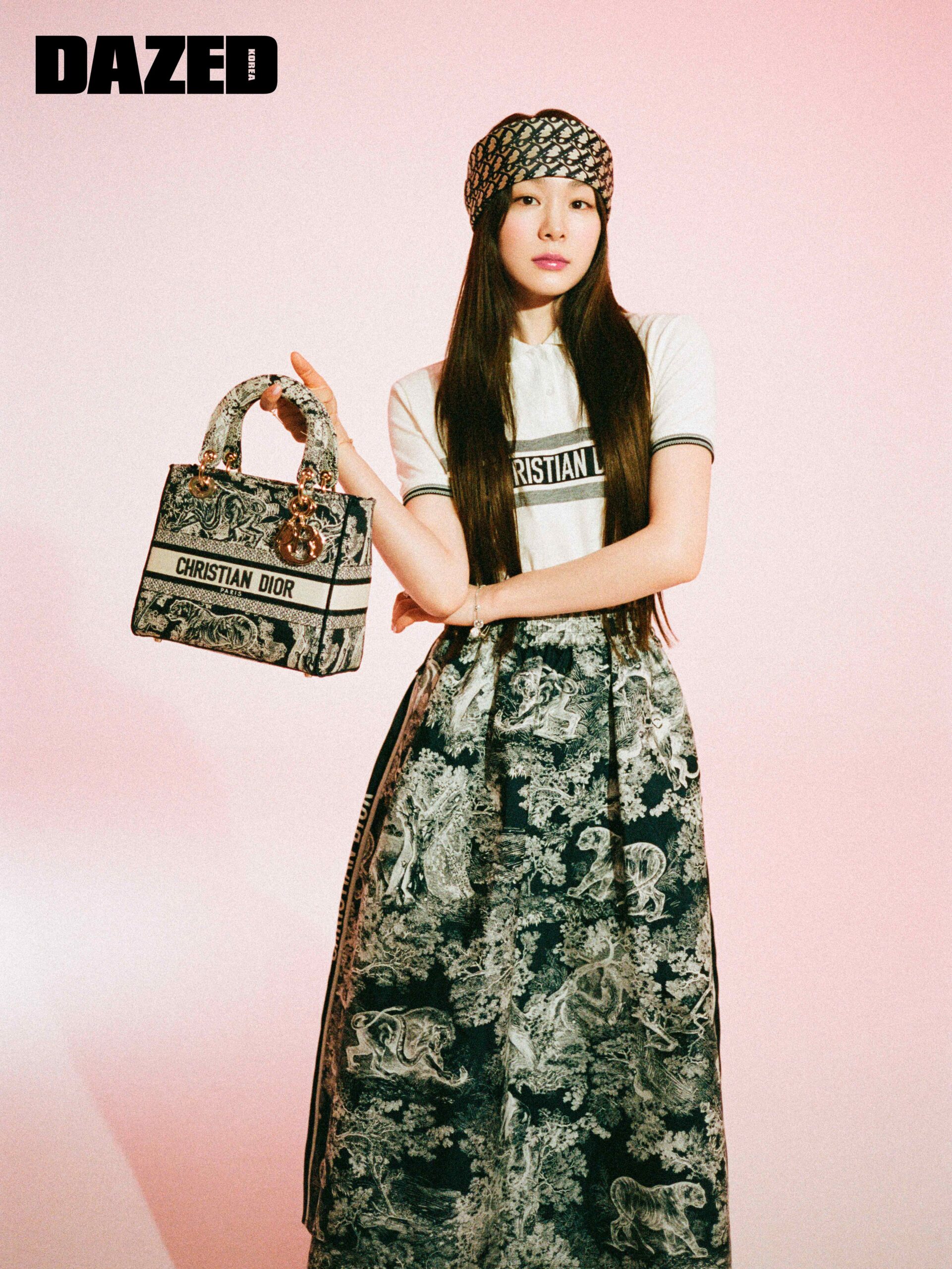 에크루 폴로셔츠와 디올 트왈 드 주이 모티브가 돋보이는 플레어스커트, 헤어밴드로 연출한 디올 오블리크 패턴의 실크 스카프, 인디고 블루 색상의 촘촘한 엠브로이더리 장식과 ‘DIOR’ 블록 참이 매력적인 레이디 디올 백은 모두 디올(Dior).