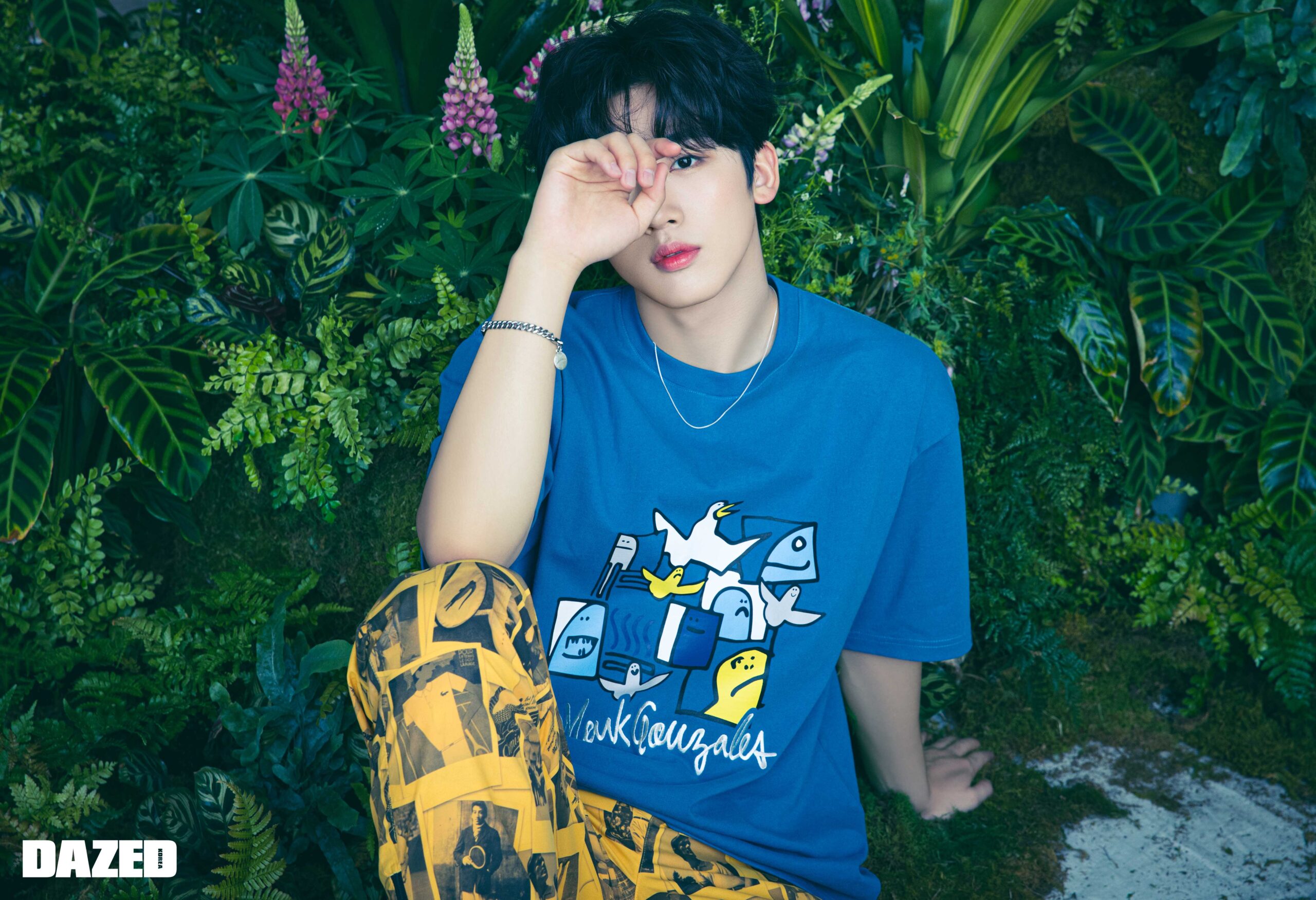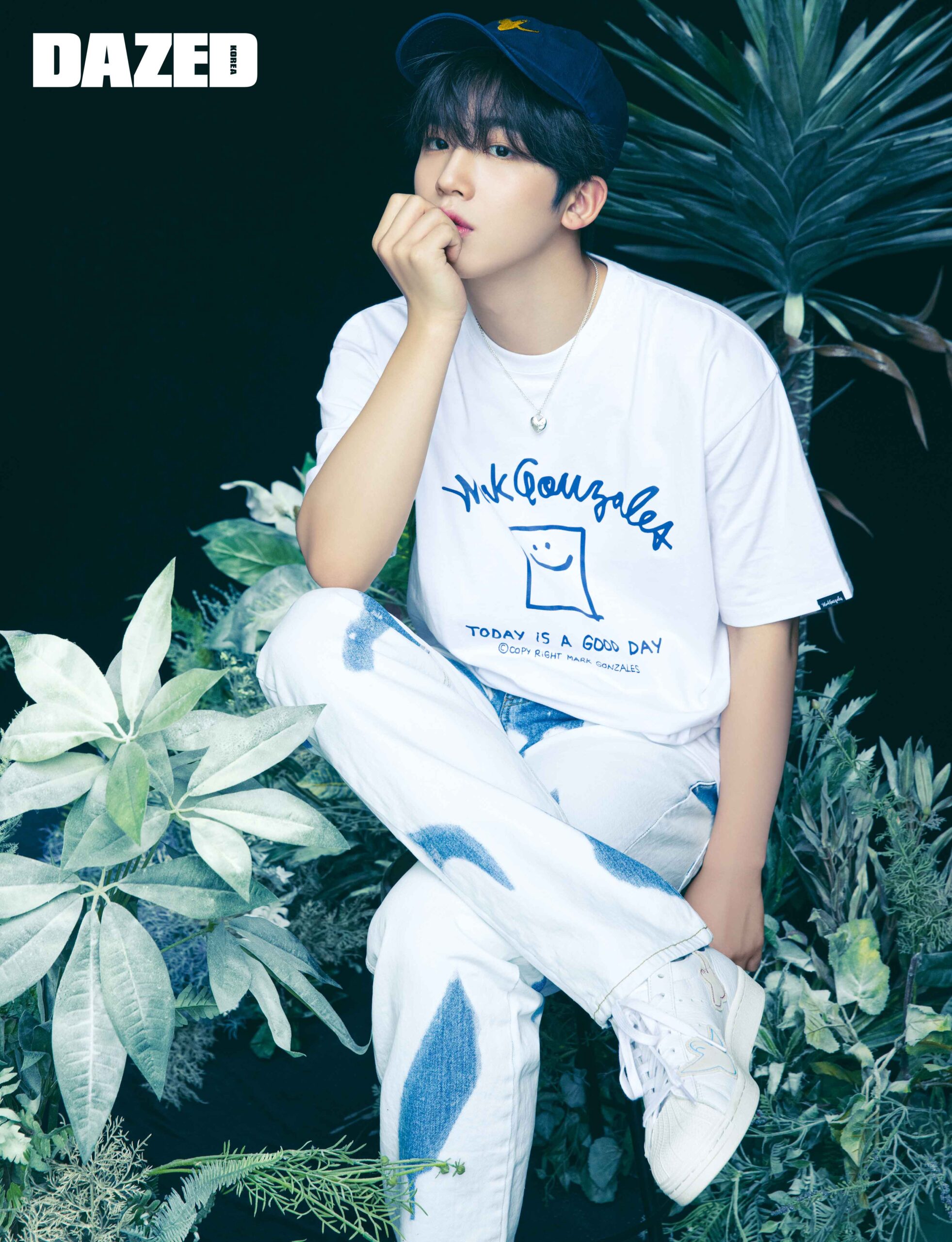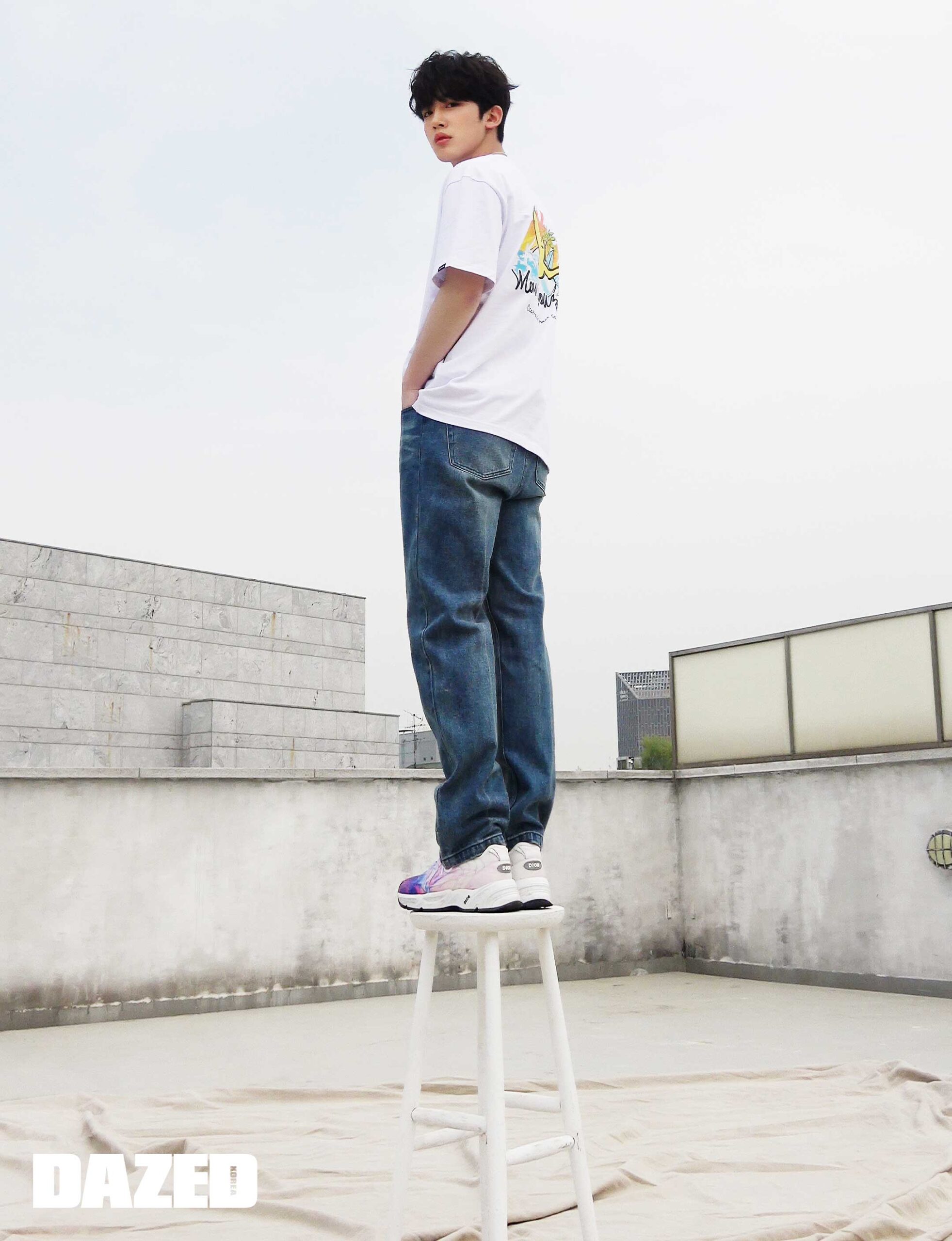 서머 엔젤 반팔 티셔츠는 마크 곤잘레스(Mark Gonzales), 스니커즈는 디올 맨(Dior Men), 팬츠는 스타일리스트의 것.
