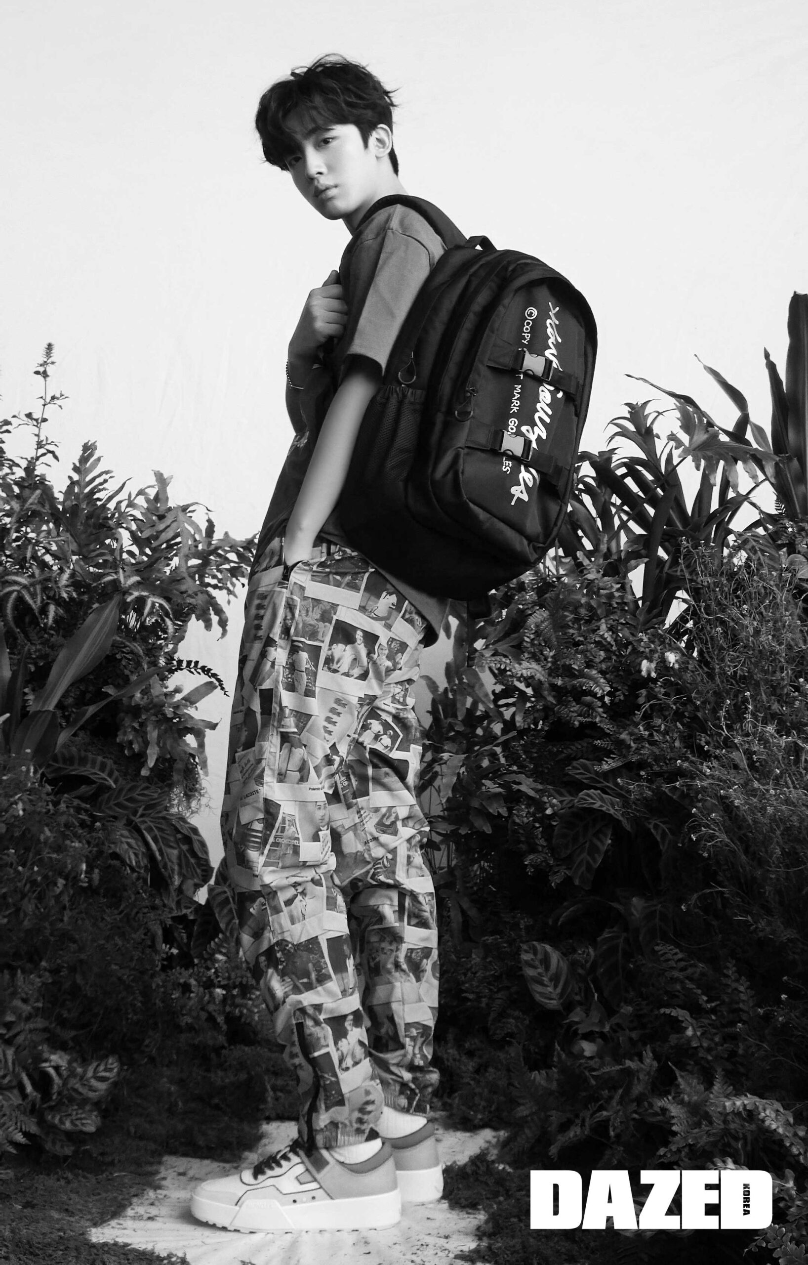 오션 드로잉 반팔 티셔츠와 바인드 백팩은 마크 곤잘레스(Mark Gonzales), 팬츠는 라코스테 라이브(Lacoste Live), 스니커즈는 몽클레르 컬렉션(Moncler Collection).