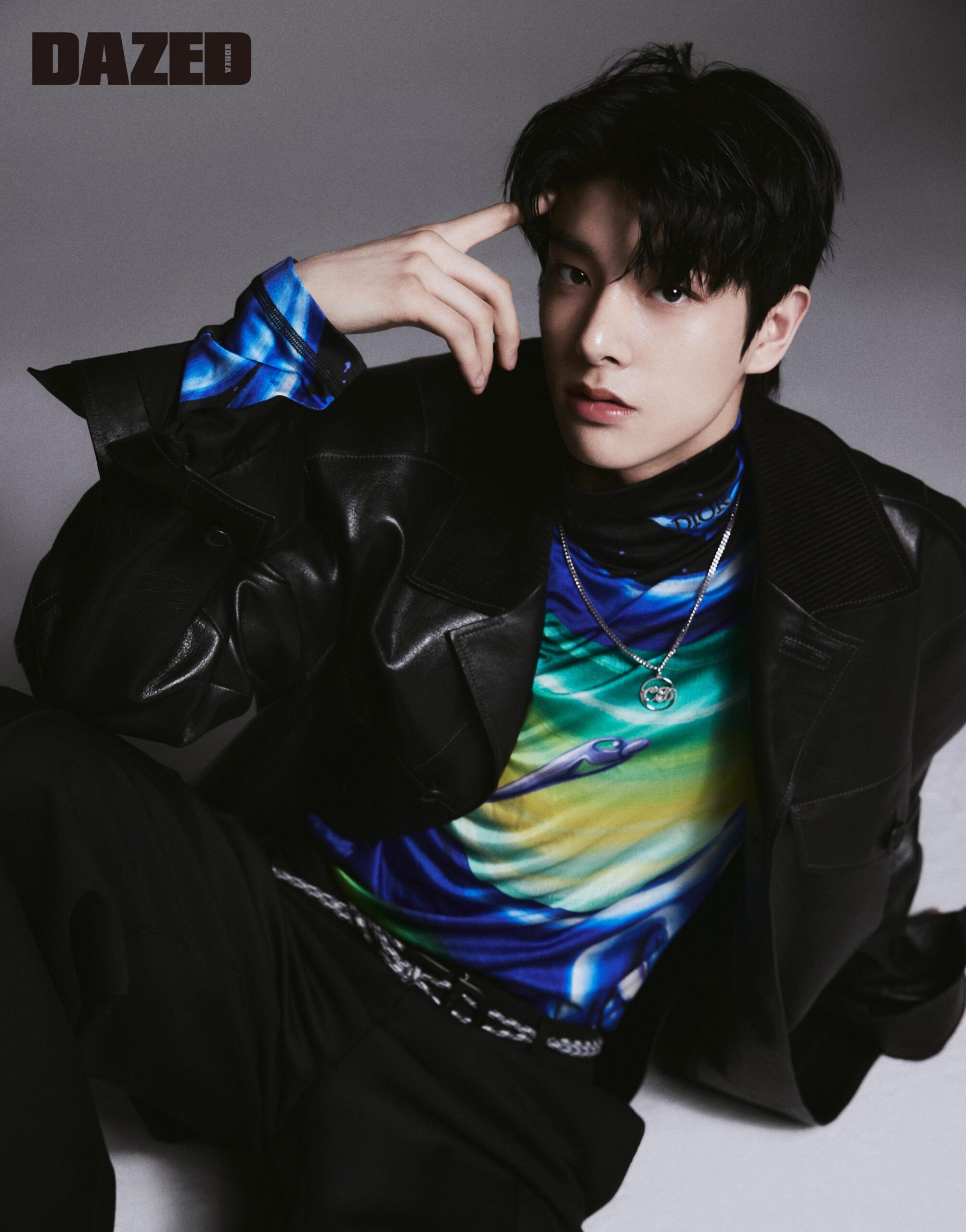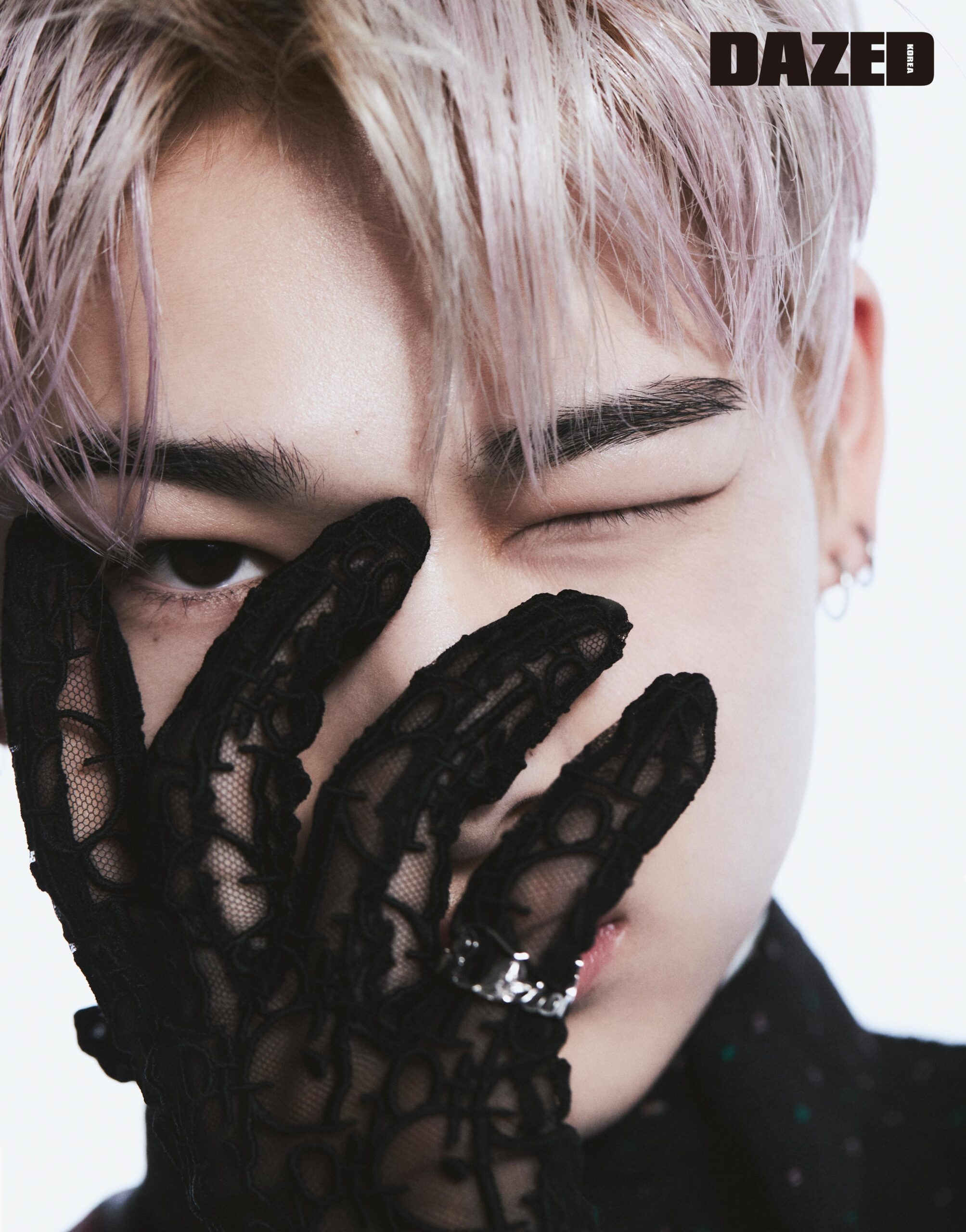 멀티컬러 오간자 셔츠와 롱 슬리브 톱, 블랙 코튼 글러브, 실버 링은 모두 디올 맨(Dior Men), 이어링은 스타일리스트의 것.