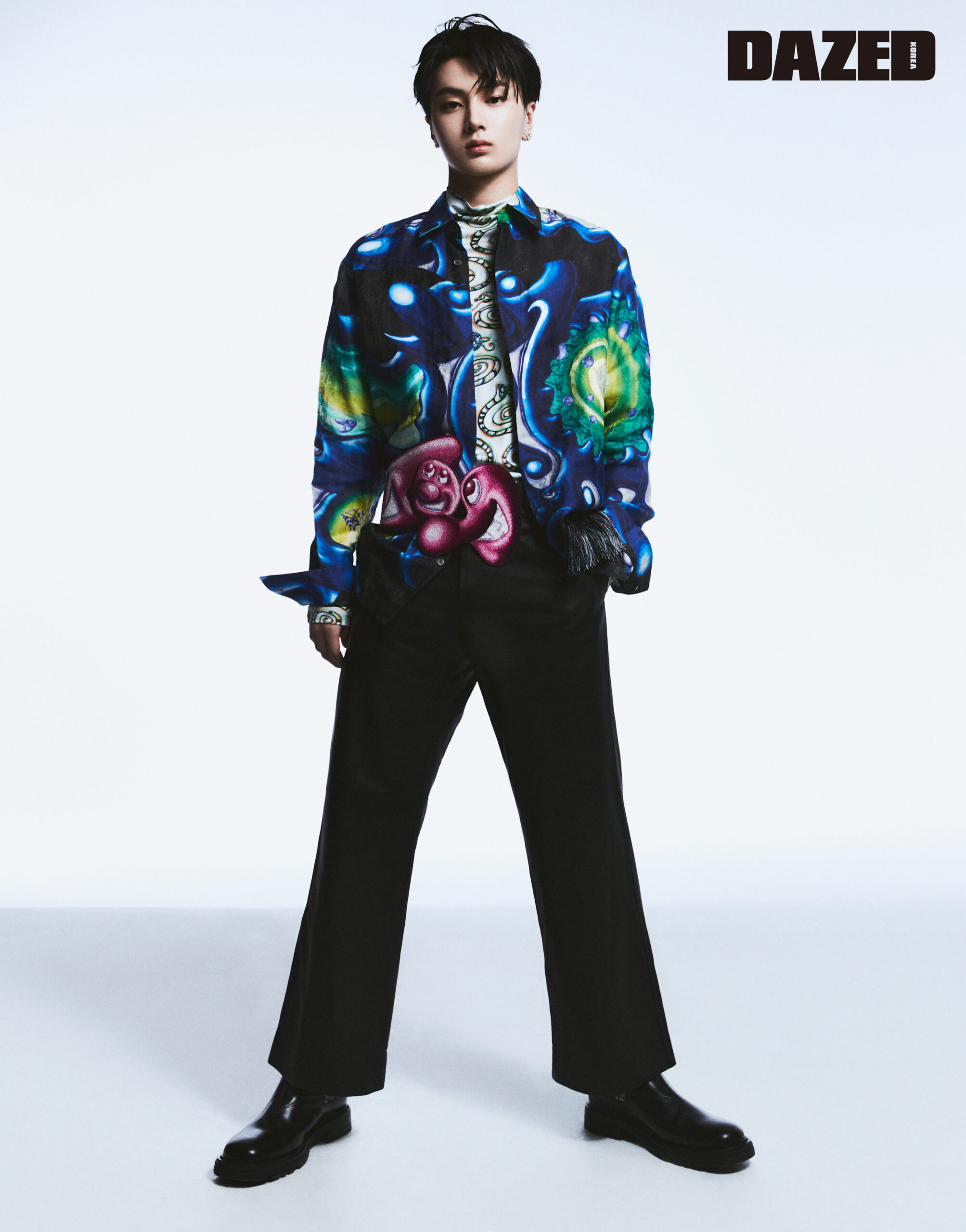 프린지 디테일의 멀티컬러 셔츠와 모크넥이 특징인 롱 슬리브 톱, 블랙 크롭트 팬츠, 블랙 첼시 부츠, 크리스털 이어링은 모두 디올 맨(Dior Men).