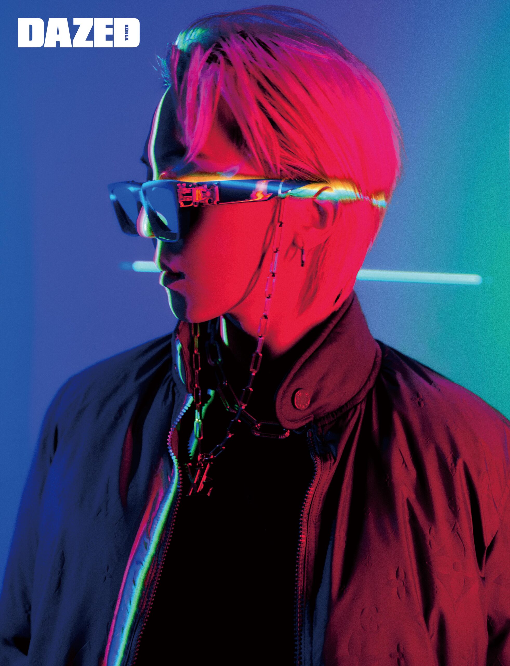 LVSE 리버시블 모노그램 다운 블루종과 인사이드 아웃 블랙 티셔츠, LV 이스케이프 스퀘어 선글라스, 선글라스 스트랩으로 연출한 LV 플라워 펜던트 네크리스는 모두 루이 비통(Louis Vuitton).