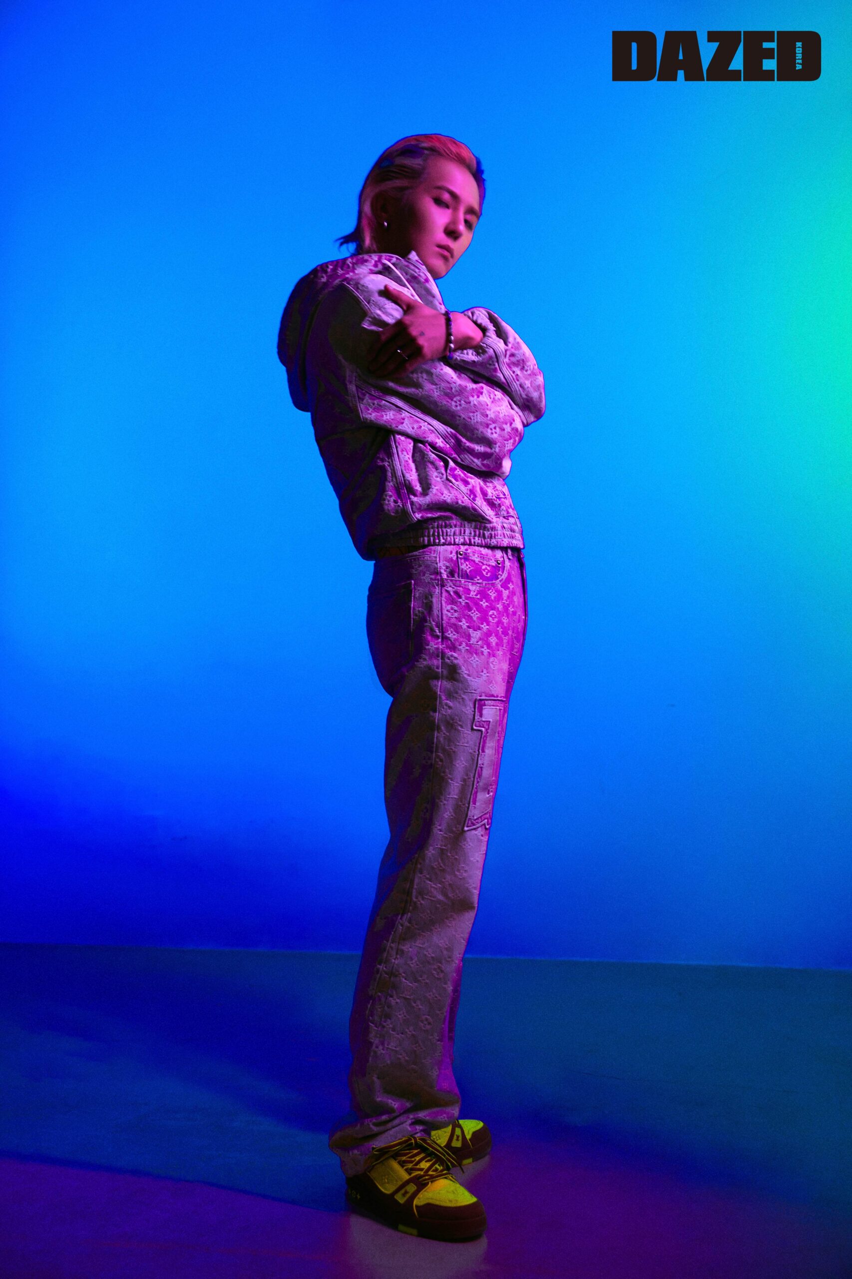 솔트 프린트 보머 재킷과 체스트 포켓 디테일의 레귤러 DNA 셔츠, 시가렛 팬츠, LV 트레이너 스니커즈는 모두 루이 비통(Louis Vuitton).