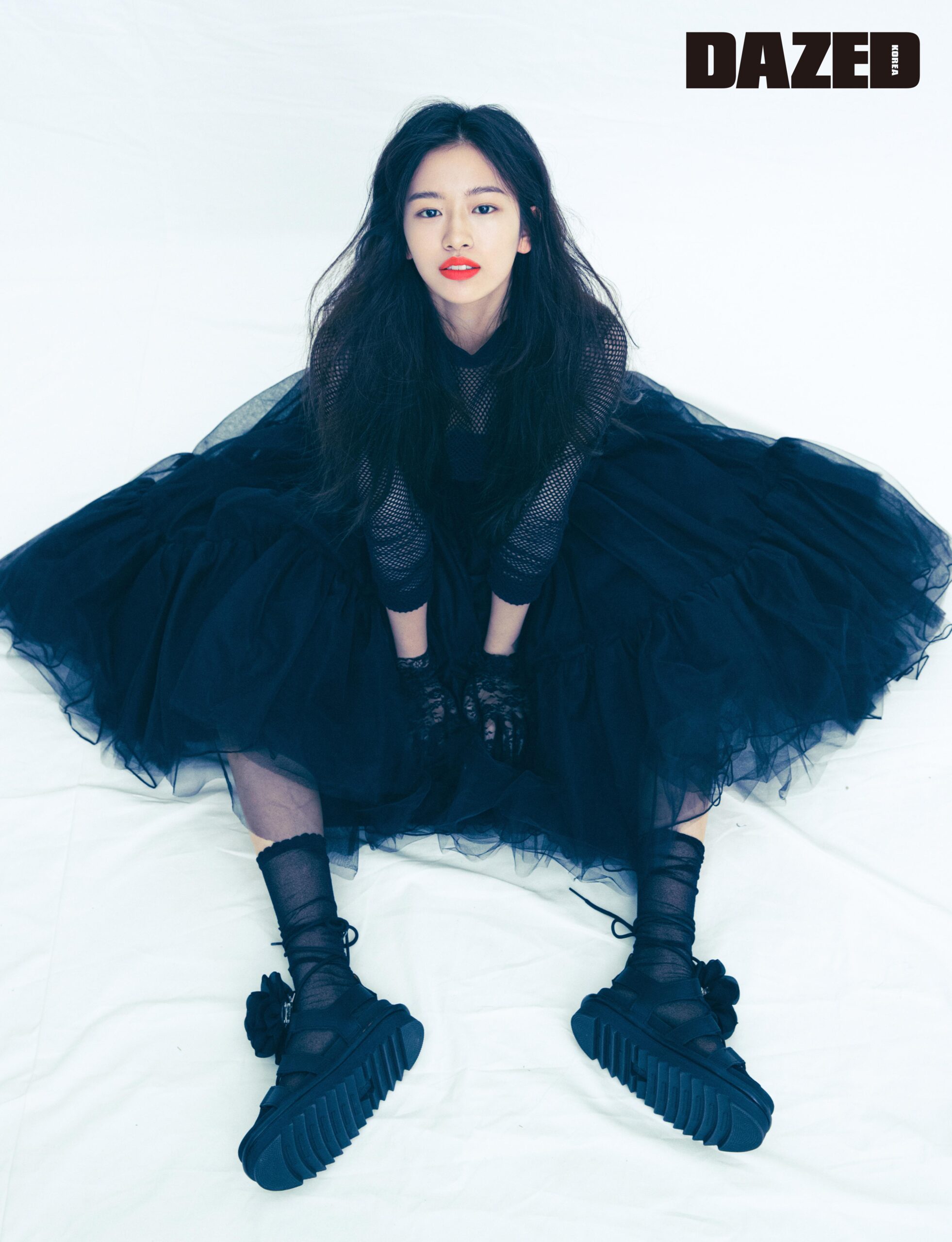 블랙 메시 톱과 튈 드레스는 미우 미우(Miu Miu), 스트랩 샌들은 닥터마틴(Dr. Martens), 레이스 글러브와 시스루 삭스, 샌들에 부착한 플라워 브로치는 모두 스타일리스트의 것.