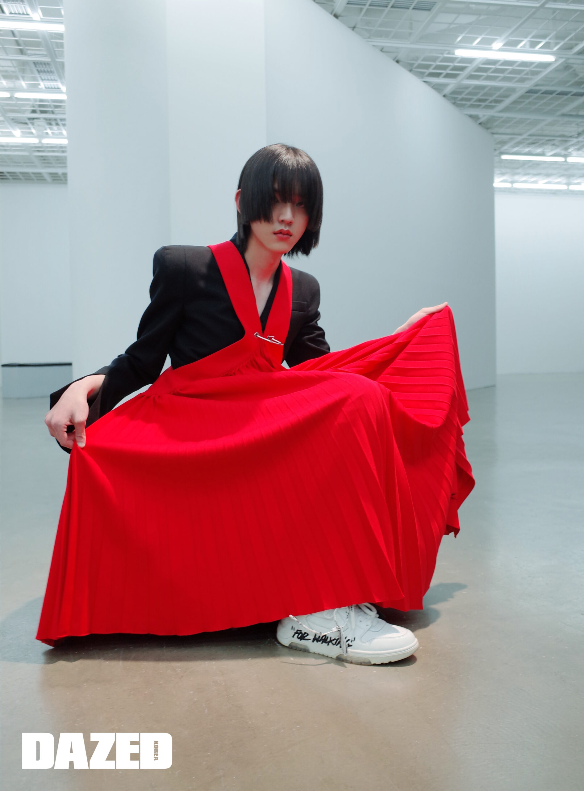 블랙 크롭트 재킷과 레드 플리츠 드레스, 앵클 슬릿 디테일 팬츠, 아웃 오브 오피스 ‘OOO’ 스니커즈는 모두 오프화이트(Off-WhiteTM).