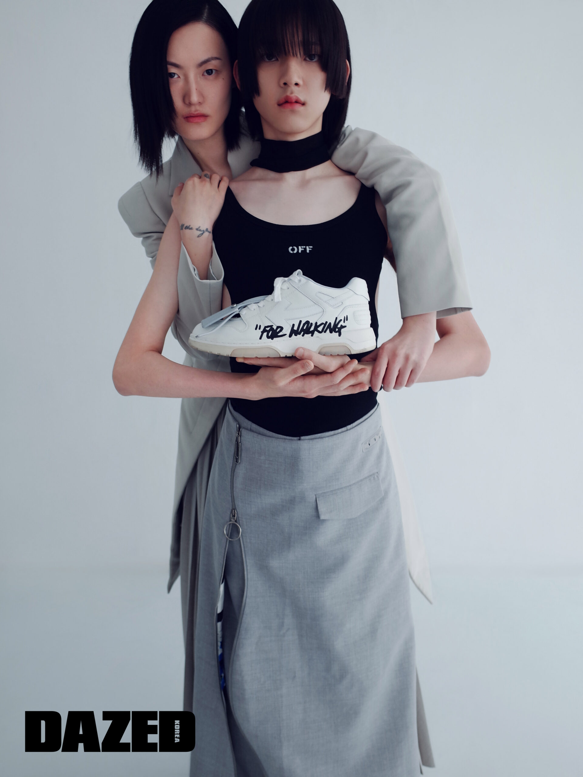 혜승이 입은 패디드 그레이 코트와 저지 톱, 롱 플리츠스커트, 아웃 오브 오피스 ‘OOO’ 스니커즈, 못 버클 디테일의 레더 벨트는 모두 오프화이트(Off-WhiteTM). 지용이 입은 컷아웃 탱크톱과 플로럴 프린트 안감이 돋보이는 그레이 스커트 팬츠, 아웃 오브 오피스 ‘OOO’ 스니커즈, 블랙 시폰 넥 스카프, 손에 든 아웃 오브 오피스 ‘OOO’ 스니커즈는 모두 오프화이트(Off-WhiteTM).