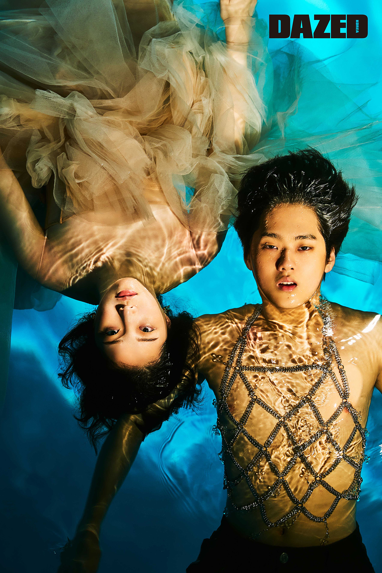 효빈이 입은 핑크색 튈 드레스는 알렉산더 맥퀸(Alexander McQueen). 재준이 착용한 실버 보디 체인은 뎀 프로젝트(Dem Project), 팬츠는 에디터의 것.