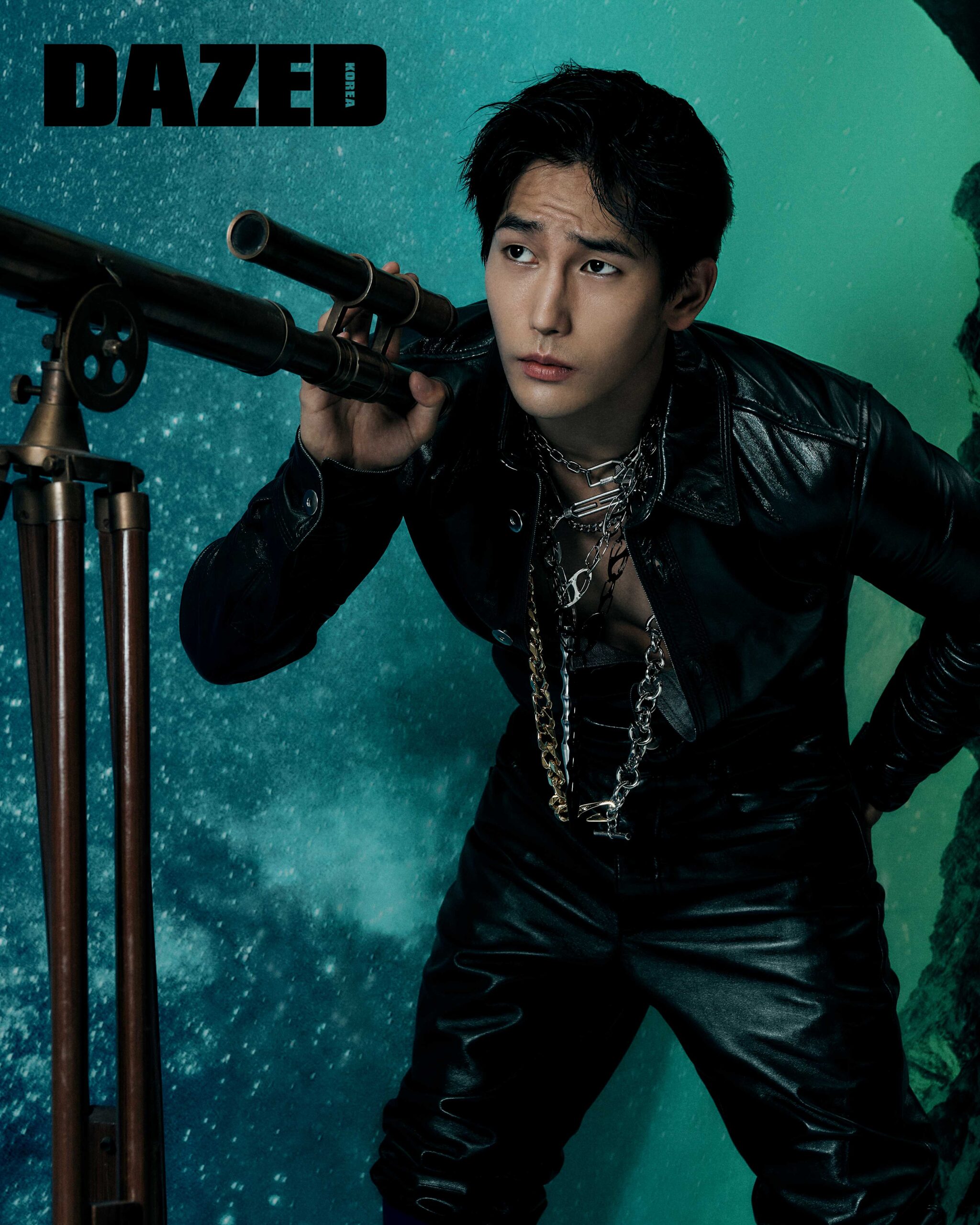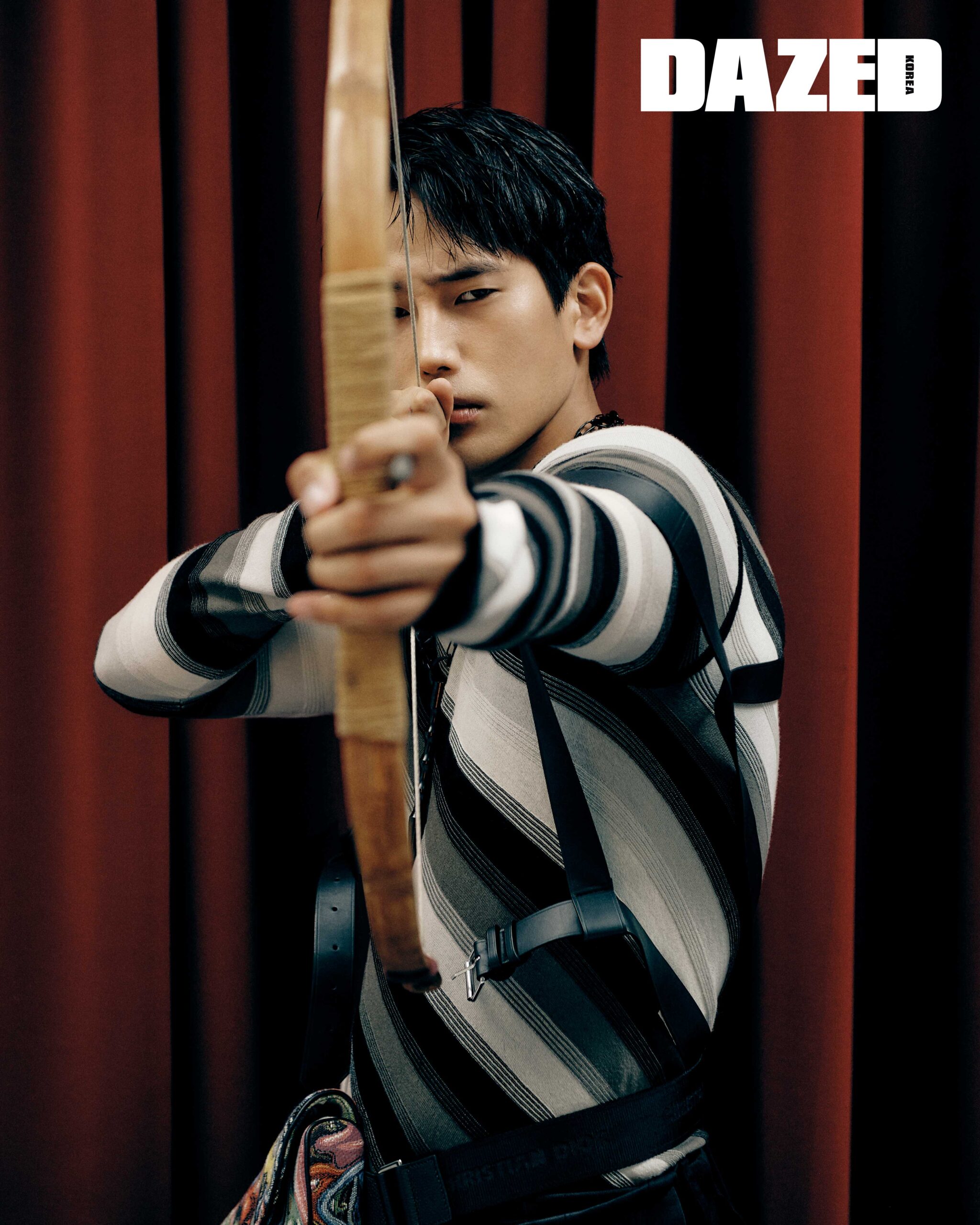 스트라이프 니트 톱은 릭 오웬스(Rick Owens), 이너로 착용한 팬츠는 보테가 베네타(Bottega Veneta), 레이어링한 팬츠는 고영호(Yeongho Ko), 하네스와 워커 부츠는 알렉산더 맥퀸(Alexander McQueen), 블랙 스파인 체인 네크리스는 누템퍼러 by 키집(Nutemperor by Kizip), 새들 백은 디올 맨(Dior Men).