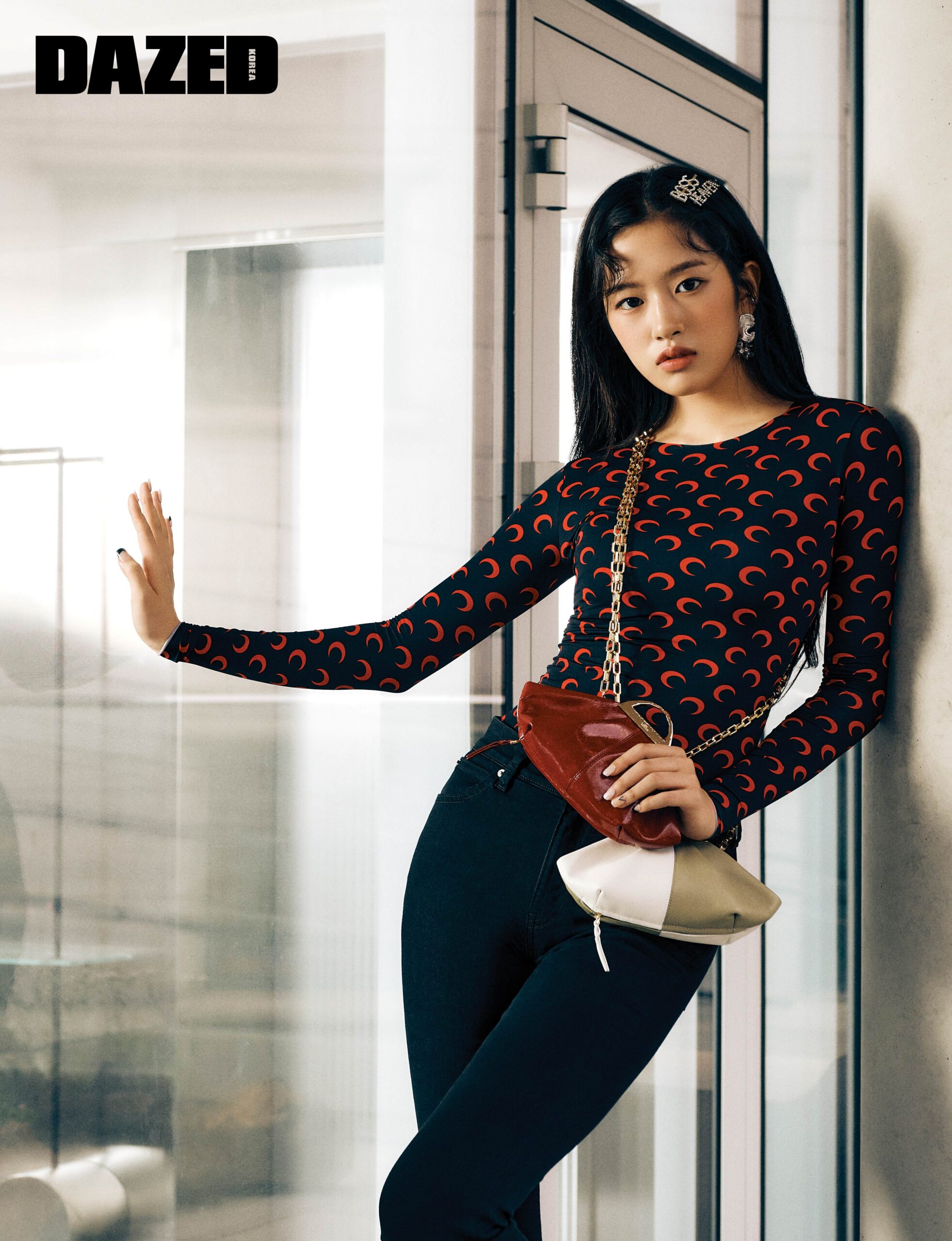 시그너처 앰버 숄더 체인과 마그네틱 플랩이 특징인 바나나 컬러 기와 백은 더 본론(The Volon), 오프숄더 크롭트 톱은 큐리티(Curetty), 프린트 데님 팬츠는 가니(Ganni), 스트랩 디테일 슈즈는 레이첼 콕스(Rachel Cox), 볼드 후프 이어링은 골든듀(Golden dew), 체인 네크리스와 체인 브레이슬릿은 아베크띵(Avecthing), 스프링 뱅글은 에브리벌스데이(Everybirthday).