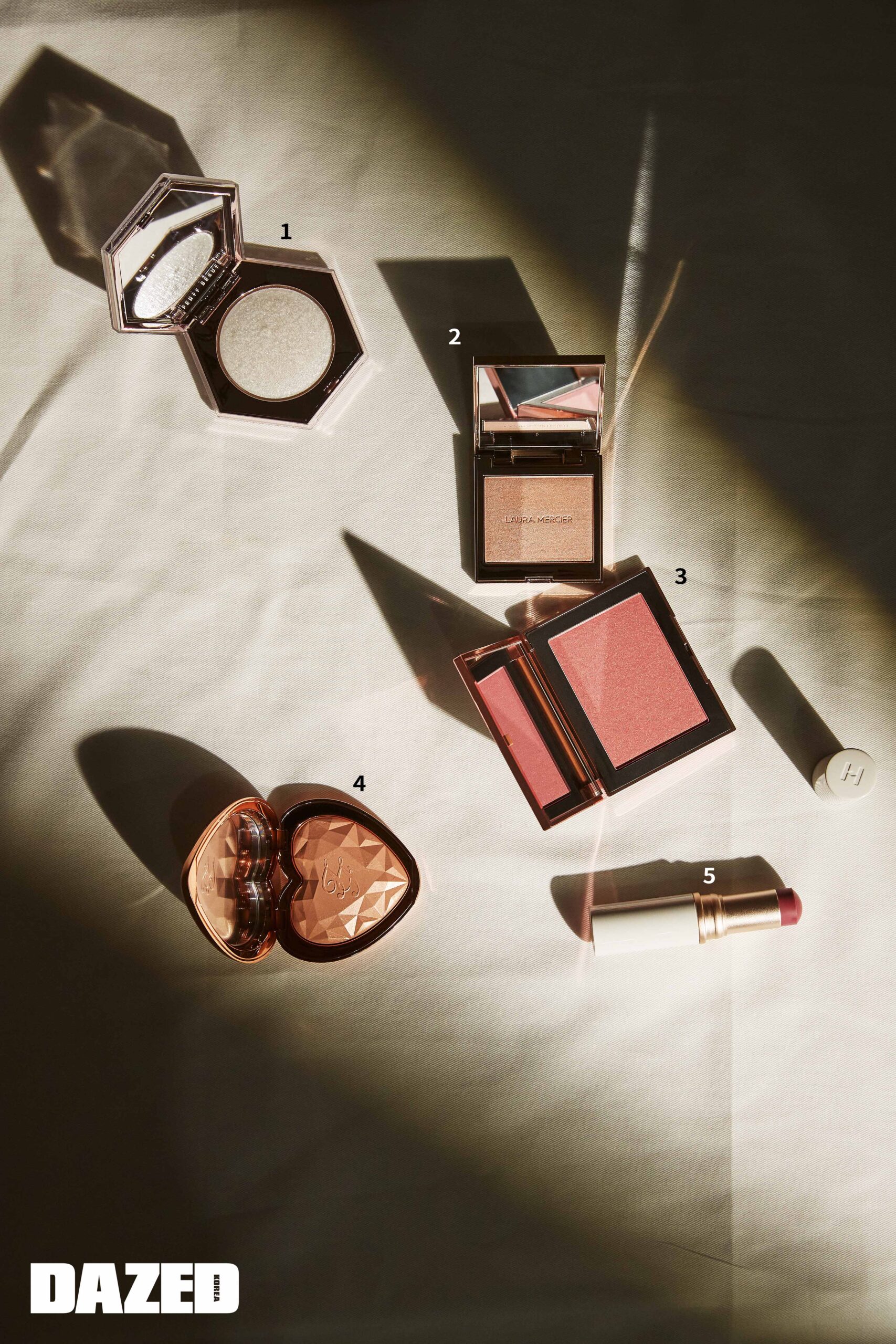 4. 햇빛에 살짝 그을린 듯 피부에 건강한 반짝임을 더하는 시어링한 로즈 골드 하이라이터. 러브 라이트 프리즈마틱 하이라이터 #레이 오브 라이트 9g 3만5000원, 투페이스드(Too Faced).