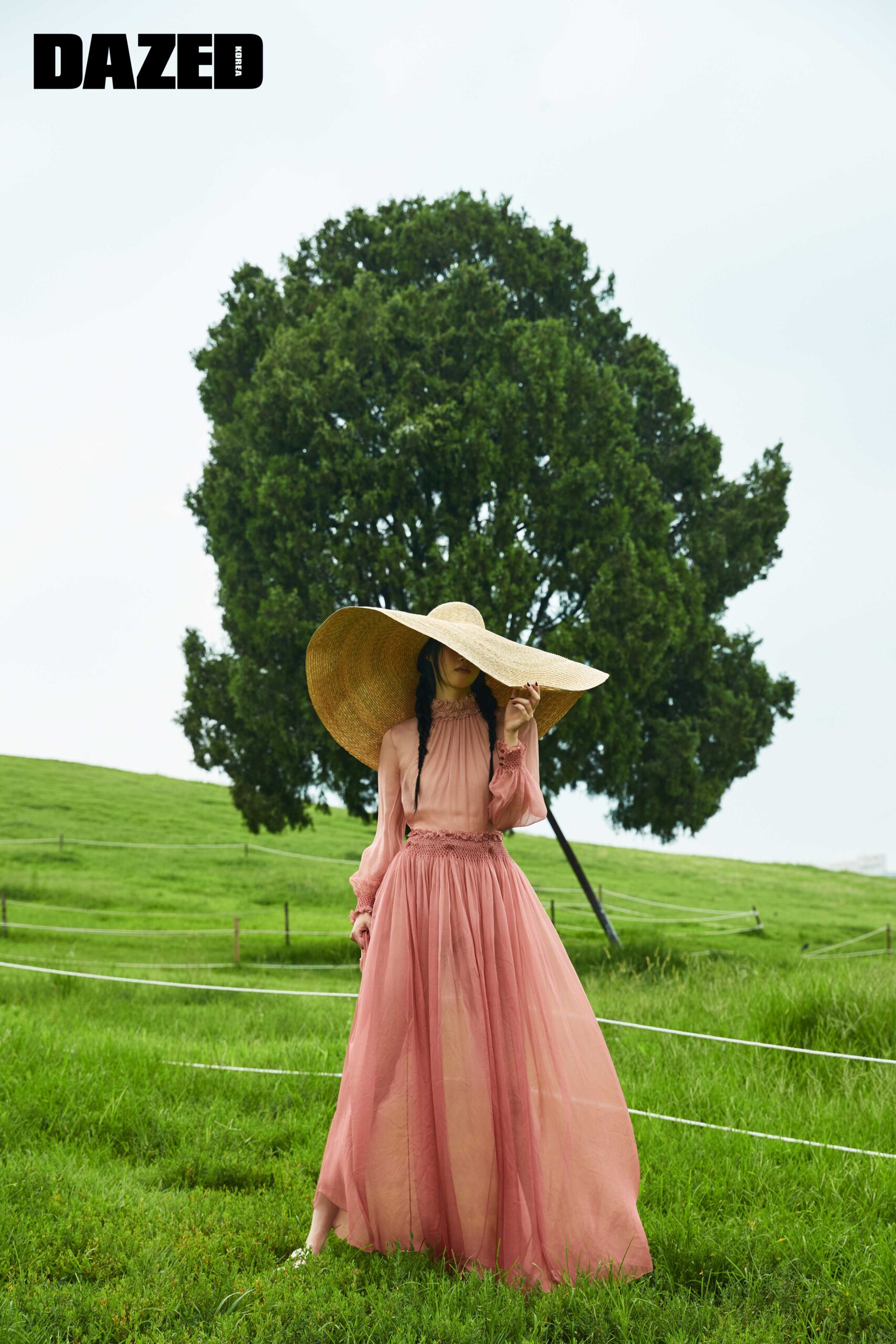 핑크 시폰 드레스와 샌들은 디올(Dior), 와이드 해트는 큐 밀리너리(Q Millinery).