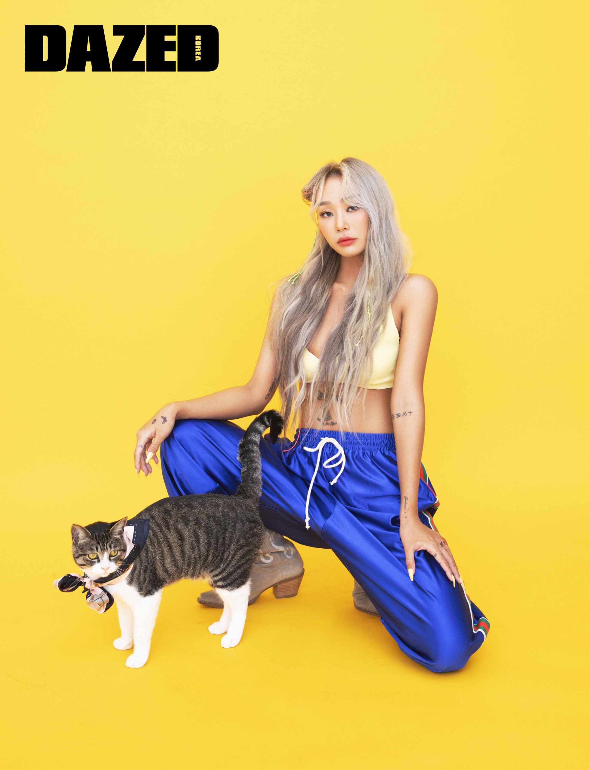 레몬 옐로 브라렛은 8 by 육스(8 by Yoox), 트랙 팬츠는 구찌(Gucci), 웨스턴 부츠는 제프리 캠벨(Jeffery Campbell). 바위가 입은 스카프는 멀버리(Mulberry).