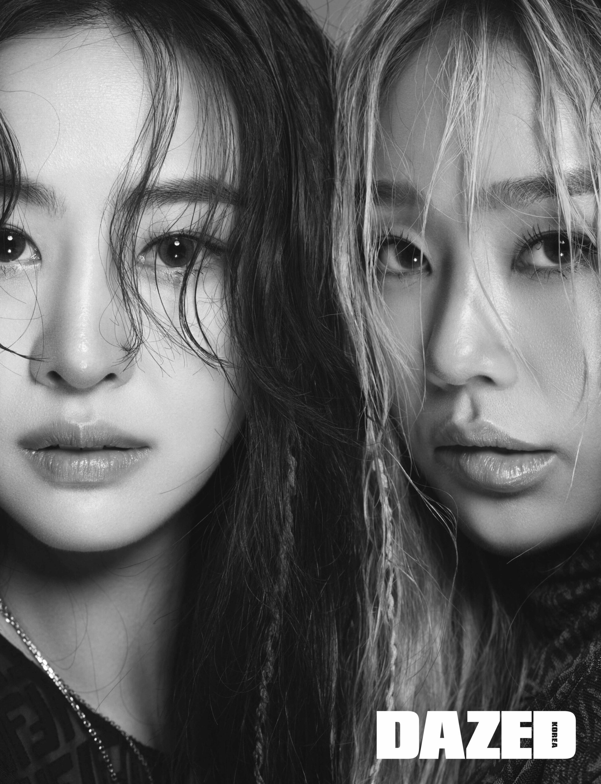 다솜이 입은 메시 톱과 네크리스는 펜디(Fendi). 효린이 입은 터틀넥 저지 톱은 펜디(Fendi).