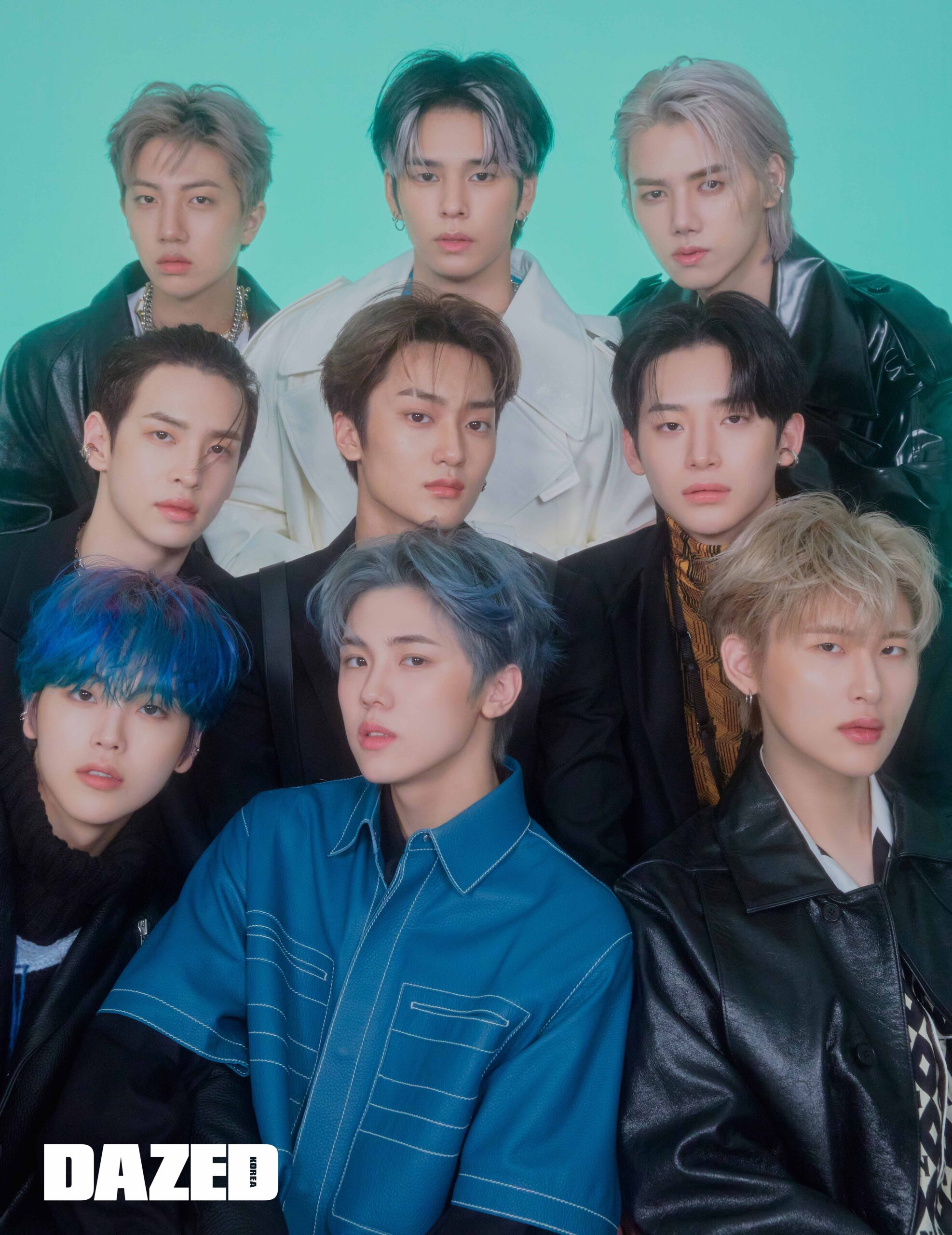 태영이 입은 블랙 재킷과 화이트 슬리브리스 톱, 팬츠, 하네스 벨트, 이어링은 모두 알렉산더 맥퀸(Alexander McQueen), 골드 네크리스는 포트레이트 리포트(Portrait Report), 이어링은 에디터의 것. 앨런이 입은 재킷과 브이넥 톱, 팬츠는 모두 보테가 베네타(Bottega Veneta), 볼드 네크리스는 포트레이트 리포트(Portrait Report), 레이어링한 체인 네크리스는 스틸에디션(Steel Edition). 정모가 입은 블랙 재킷과 옐로 패턴 보디슈트, 팬츠, 네크리스로 연출한 리나일론 미니 파우치는 모두 프라다(Prada), 이어 커프는 에디터의 것. 형준이 입은 레더 재킷은 홀리넘버세븐(Holy Number 7), 터틀넥 톱은 스도쿠(soduk), 화이트 첼시 부츠는 후망(Humant), 이어 커프는 포트레이트 리포트(Portrait Report), 팬츠는 에디터의 것. 성민이 입은 레더 하프 슬리브 셔츠는 벨루티(Berluti), 이너로 레이어링한 블랙 셔츠는 발렌티노 by 육스(Valentino by YOOX), 팬츠는 간트(Gant), 슈즈는 디올 맨(Dior Men). 우빈이 입은 레더 재킷은 누마레(Nouvmaree), 패턴 프린트 셔츠는 발렌티노(Valentino), 팬츠는 누마레(Nouvmaree), 체인 디테일 슈즈는 쏘유레슈어(So.U:Lesures), 이어링은 우빈의 것. 세림이 입은 블루 그린 컬러의 안감이 특징인 화이트 트렌치 재킷은 보테가 베네타(Bottega Veneta), 이너로 입은 블랙 톱은 써저리(Surgery), 체인 네크리스는 스틸에디션(Steel Edition), 이어링은 세림의 것. 원진이 입은 레더 재킷은 누마레(Nouvmaree), 화이트 이너 톱은 쿠도스(kudos). 민희가 입은 블랙 트렌치 재킷은 보테가 베네타(Bottega Veneta), 화이트 이너 톱은 COS.