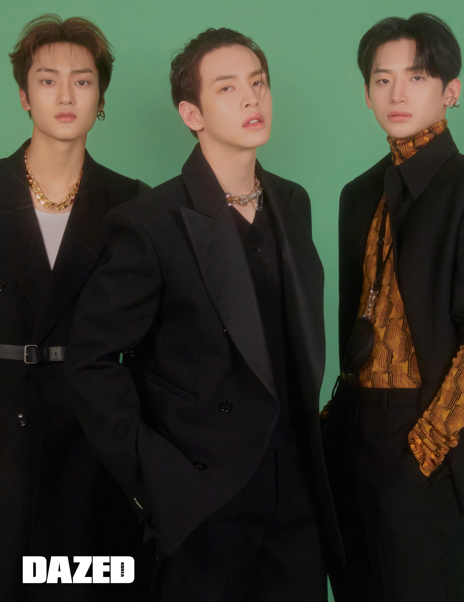 태영이 입은 블랙 재킷과 화이트 슬리브리스 톱, 팬츠, 하네스 벨트, 이어링은 모두 알렉산더 맥퀸(Alexander McQueen), 골드 네크리스는 포트레이트 리포트(Portrait Report), 이어링은 에디터의 것. 앨런이 입은 재킷과 브이넥 톱, 팬츠는 모두 보테가 베네타(Bottega Veneta), 볼드 네크리스는 포트레이트 리포트(Portrait Report), 레이어링한 체인 네크리스는 스틸에디션(Steel Edition). 정모가 입은 블랙 재킷과 옐로 패턴 보디슈트, 팬츠, 네크리스로 연출한 리나일론 미니 파우치는 모두 프라다(Prada), 이어 커프는 에디터의 것.