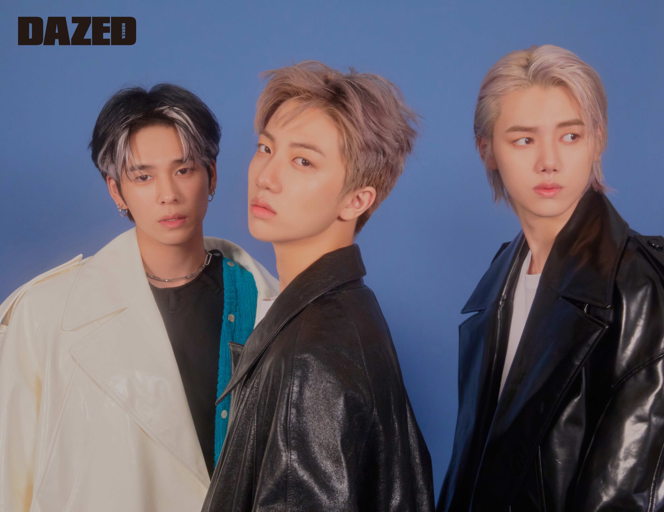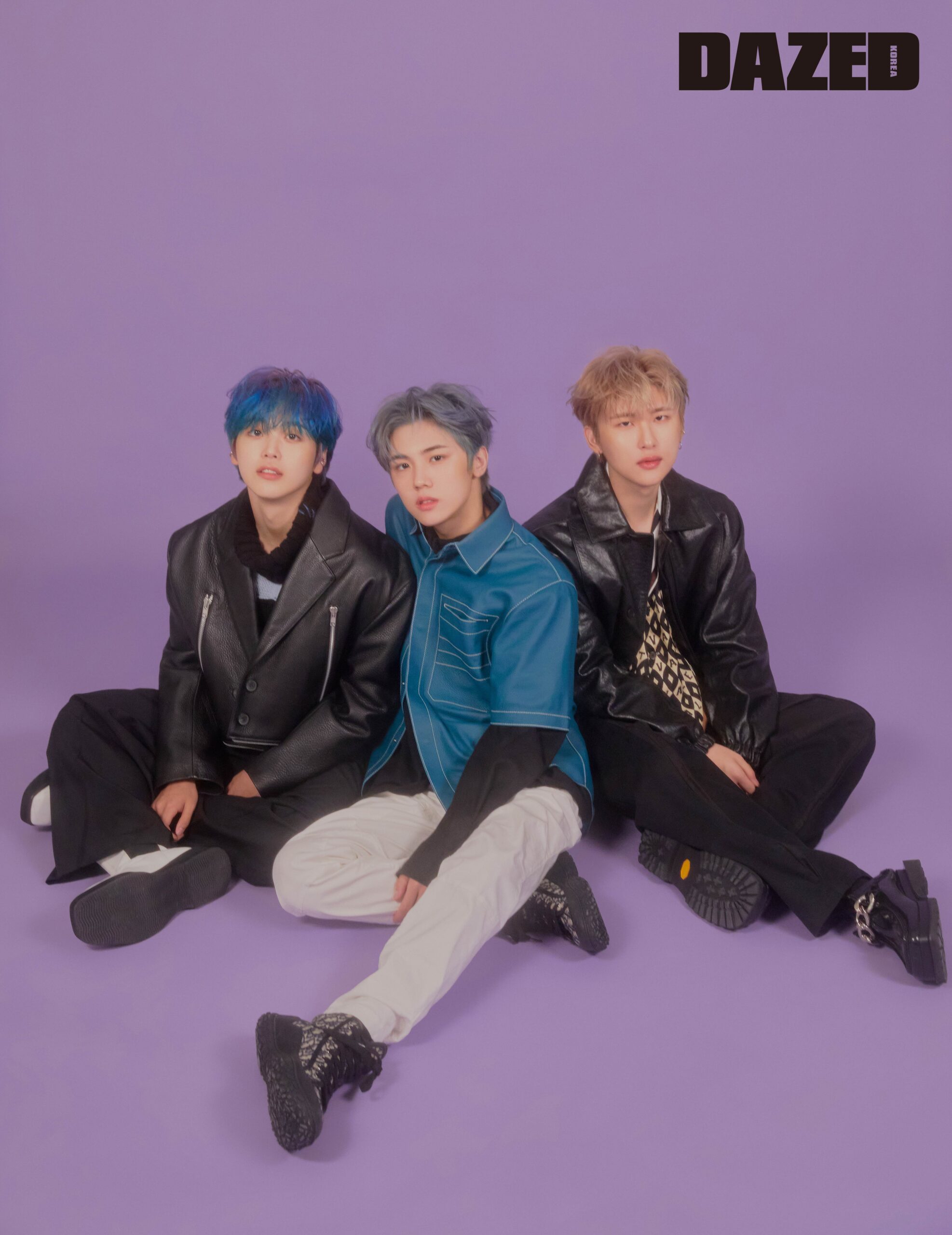 형준이 입은 레더 재킷은 홀리넘버세븐(Holy Number 7), 터틀넥 톱은 스도쿠(soduk), 화이트 첼시 부츠는 후망(Humant), 이어 커프는 포트레이트 리포트(Portrait Report), 팬츠는 에디터의 것. 성민이 입은 레더 하프 슬리브 셔츠는 벨루티(Berluti), 이너로 레이어링한 블랙 셔츠는 발렌티노 by 육스(Valentino by YOOX), 팬츠는 간트(Gant), 슈즈는 디올 맨(Dior Men). 우빈이 입은 레더 재킷은 누마레(Nouvmaree), 패턴 프린트 셔츠는 발렌티노(Valentino), 팬츠는 누마레(Nouvmaree), 체인 디테일 슈즈는 쏘유레슈어(So.U:Lesures), 이어링은 우빈의 것.