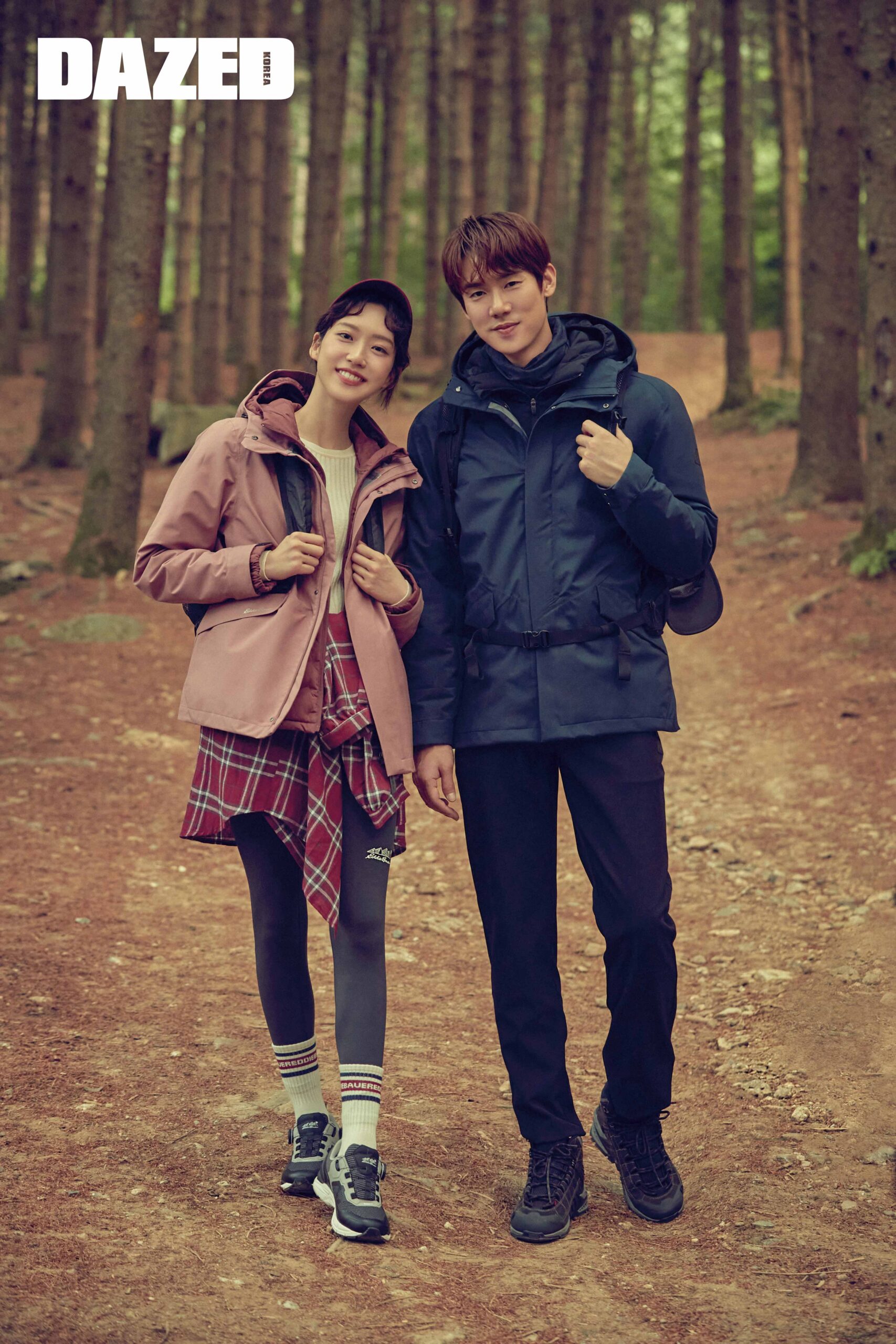 지현이 입은 핑크 컬러 윈드브레이커와 후드 집업 톱, 레깅스, 스니커즈, 로고 플레이 삭스는 모두 에디바우어(Eddie Bauer). 연석이 입은 네이비 컬러 윈드브레이커와 블랙 후드 집업 톱, 베스트, 블랙 컬러 팬츠는 모두 에디바우어(Eddie Bauer).