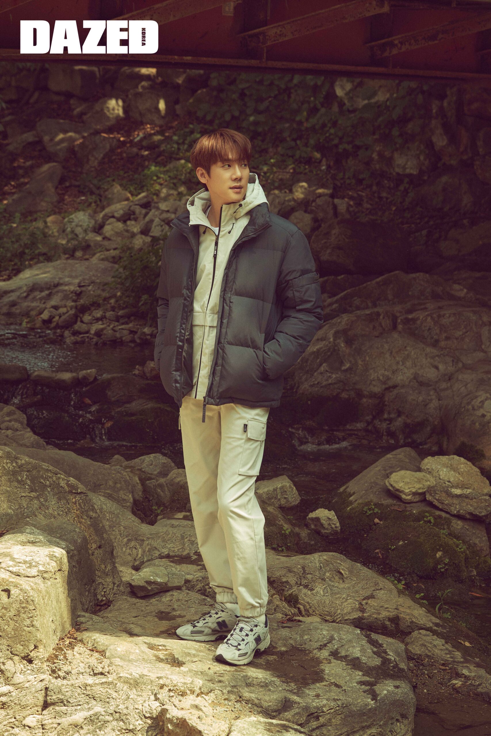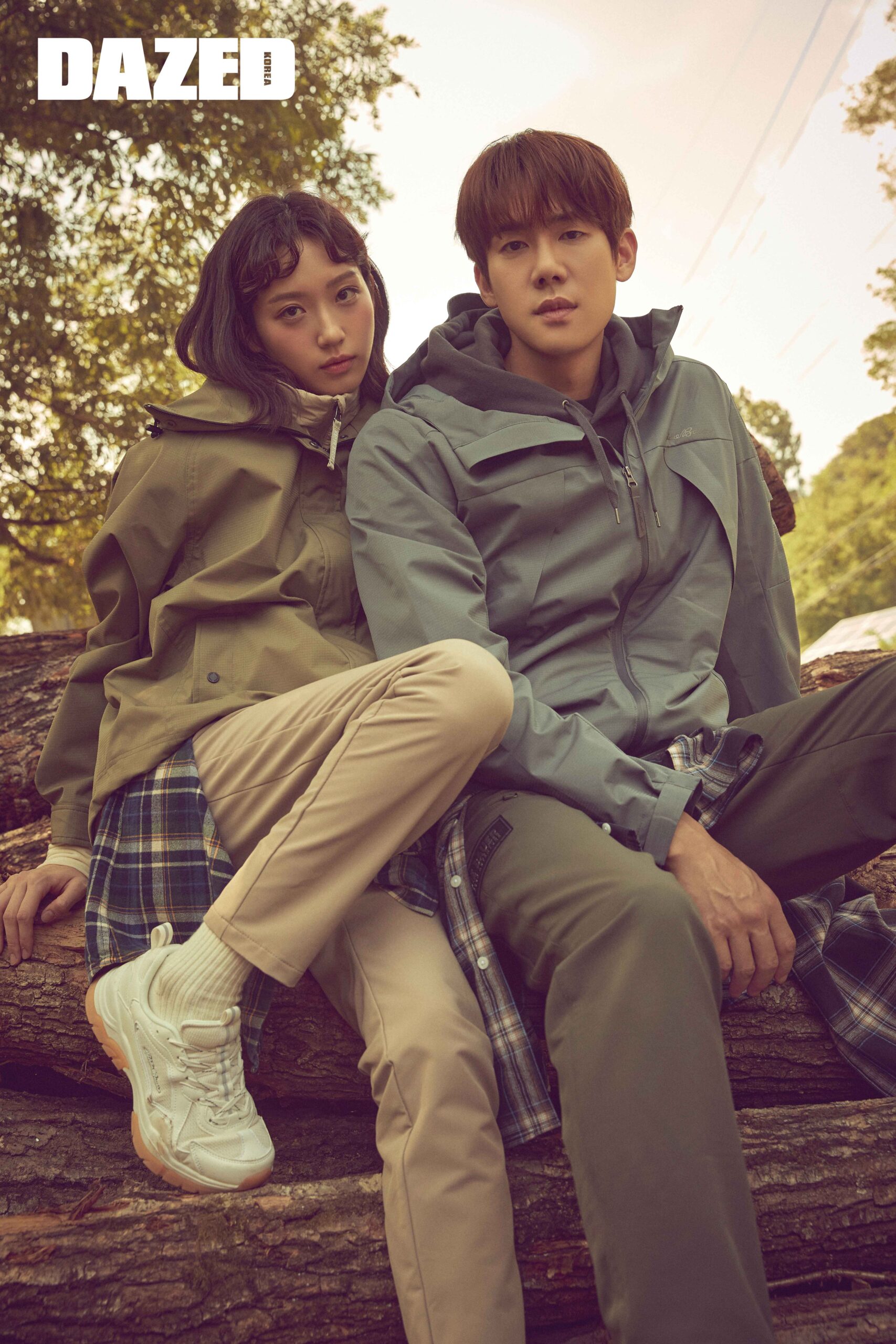 지현이 입은 카키 컬러 윈드브레이커와 안에 입은 아이보리 컬러 패딩 베스트, 팬츠, 스니커즈는 모두 에디바우어(Eddie Bauer). 연석이 입은 그레이 컬러 윈드브레이커와 카키 컬러 팬츠는 에디바우어(Eddie Bauer).