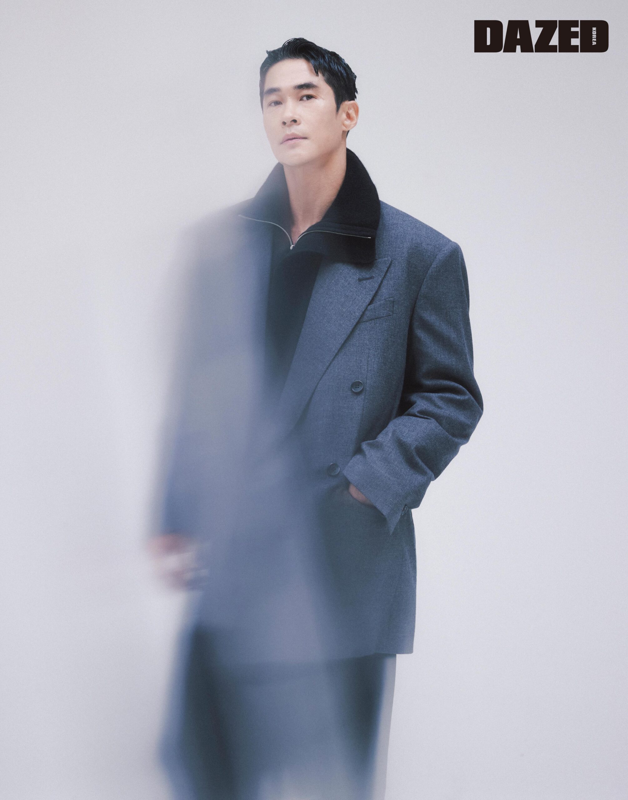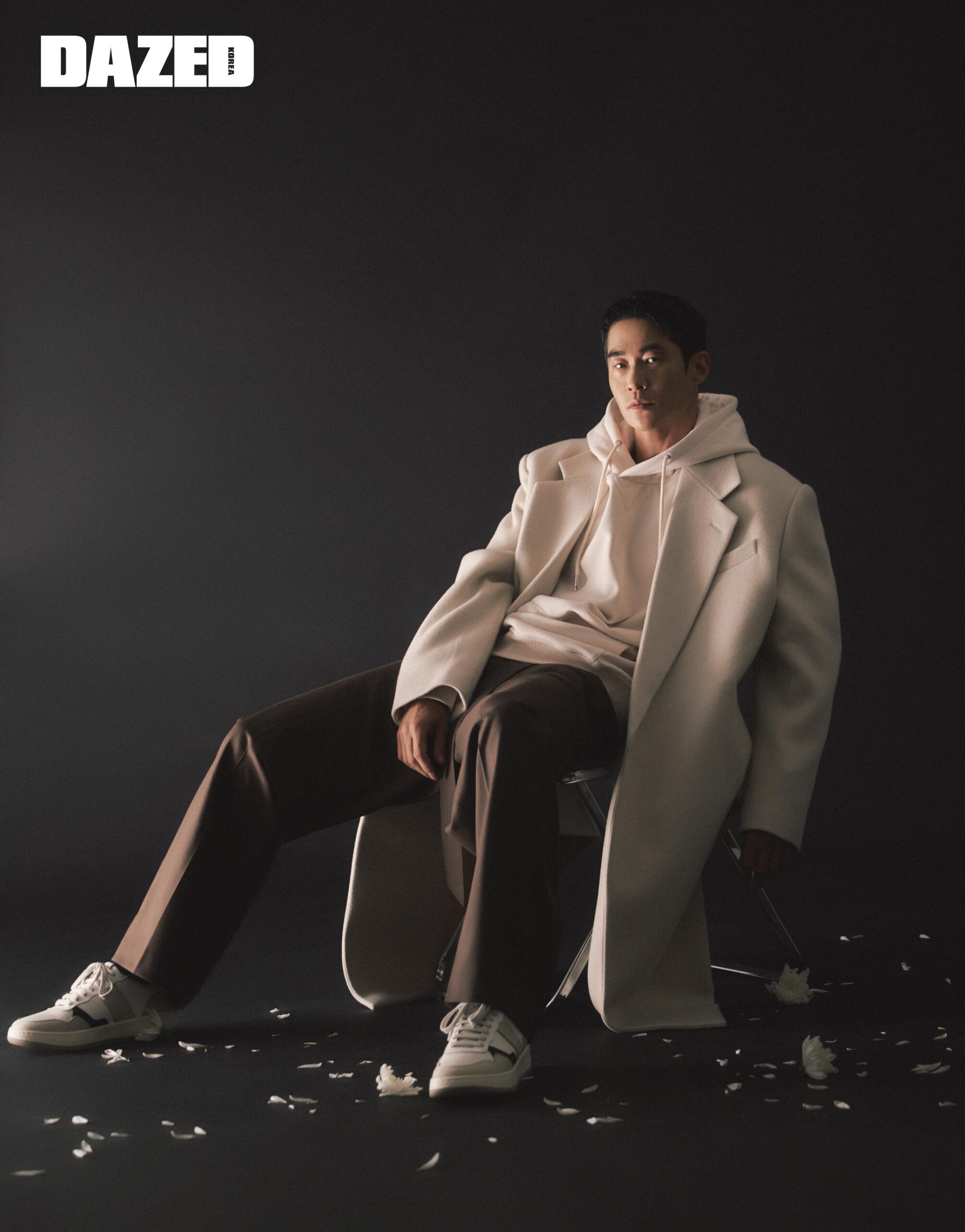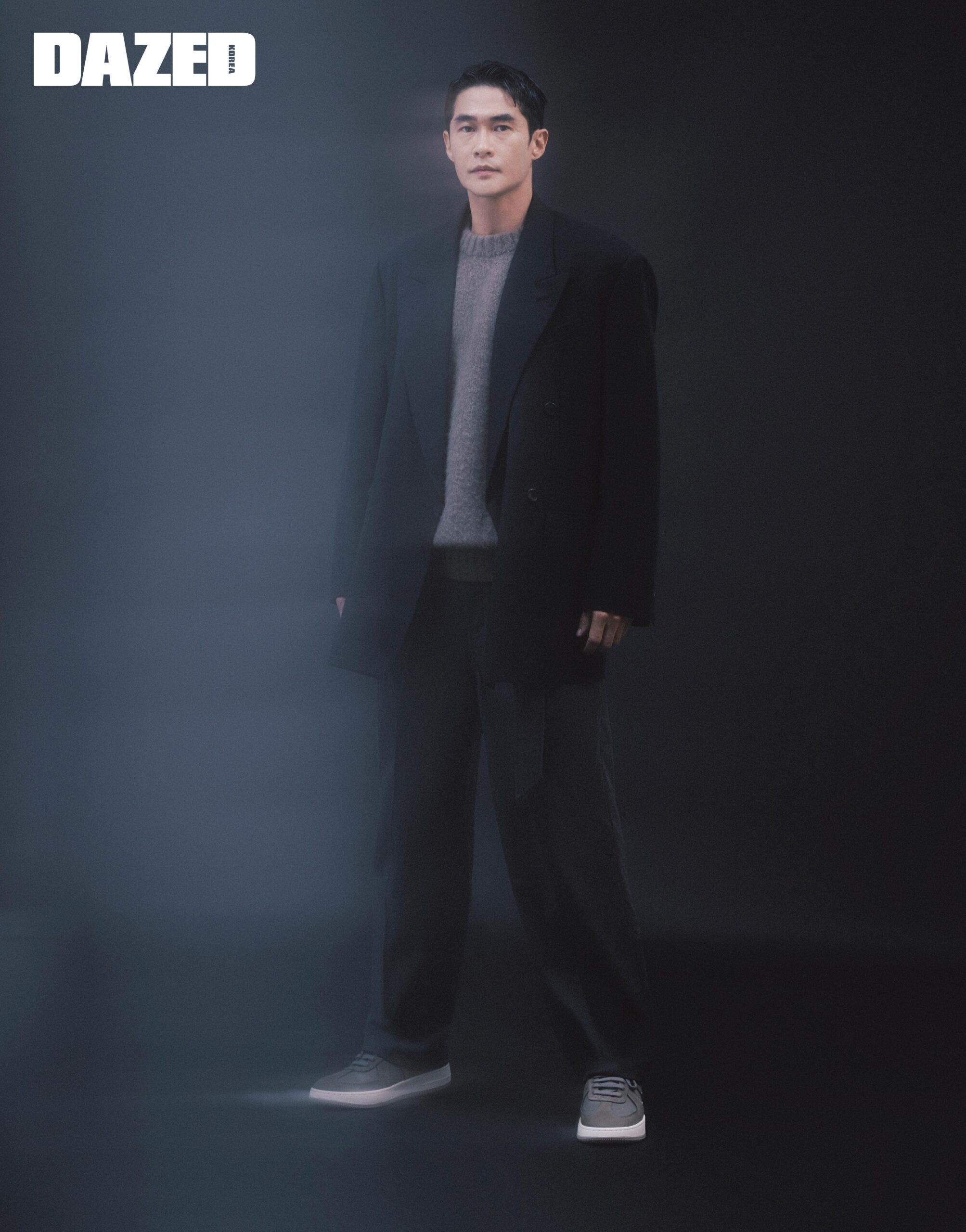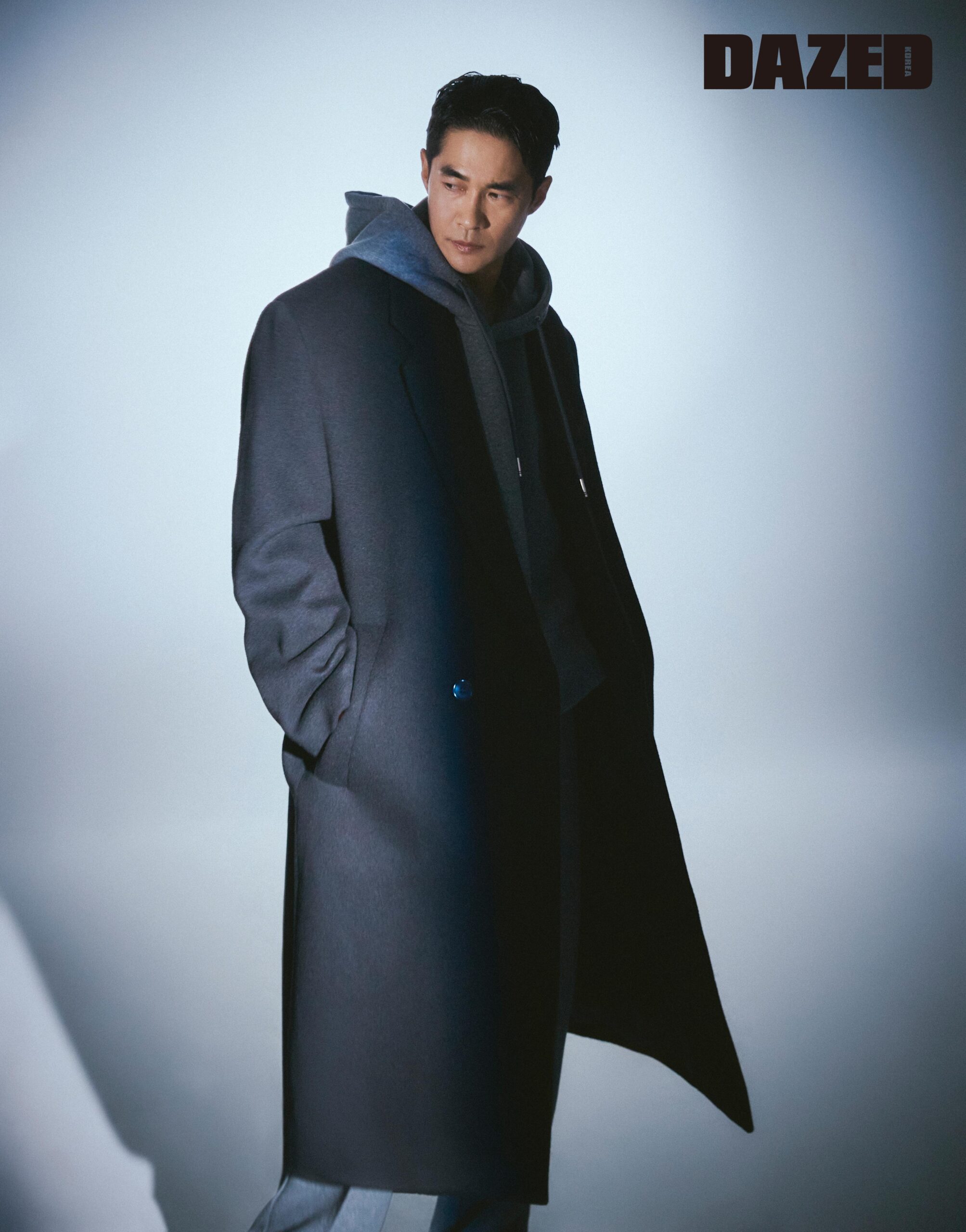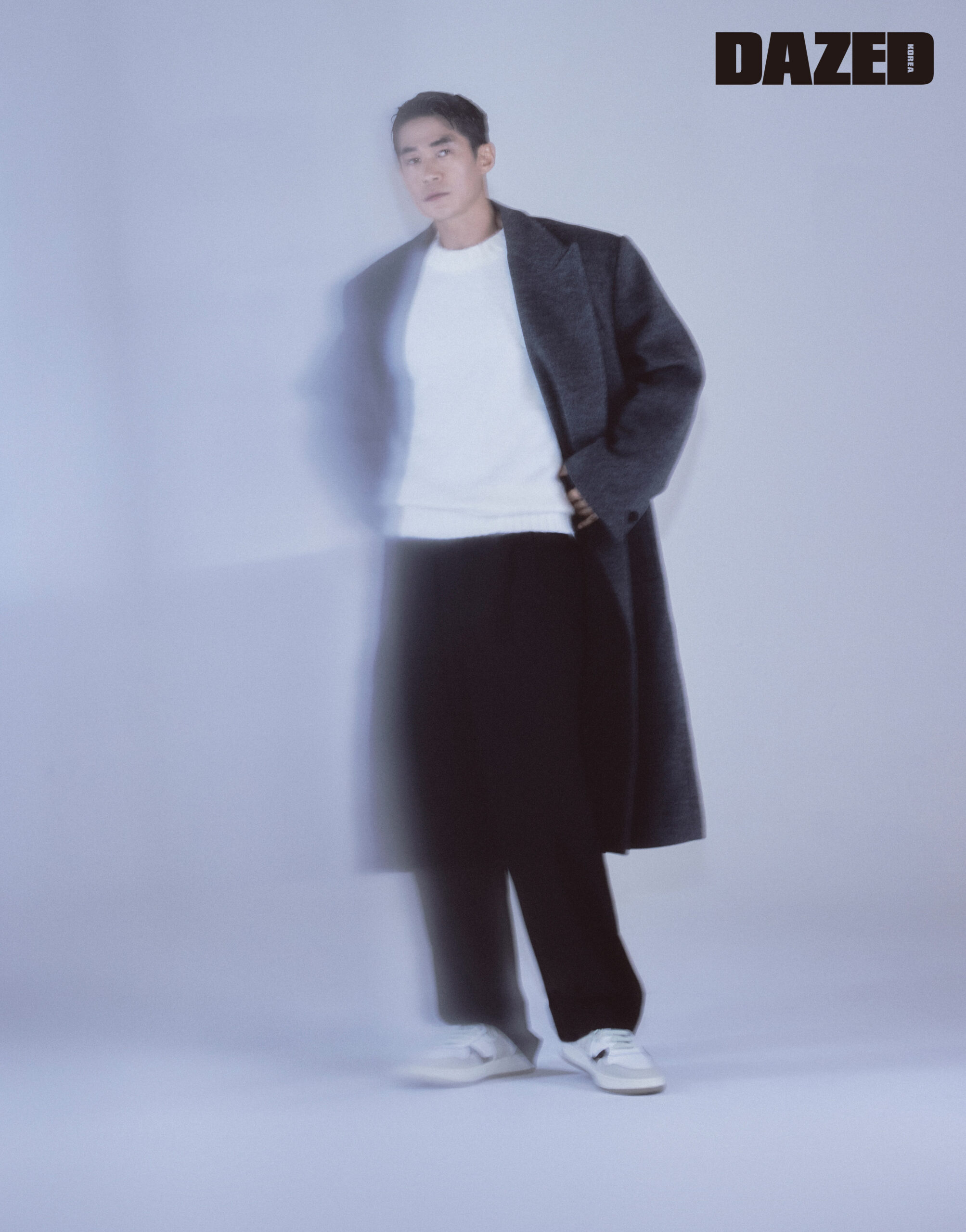 그레이 더블 코트와 스웨트셔츠, 와이드 팬츠, 고스트 스니커즈는 모두 송지오 x 배정남 아뜰리에 컬렉션(SONGZIO×BAE Atelier Collection).