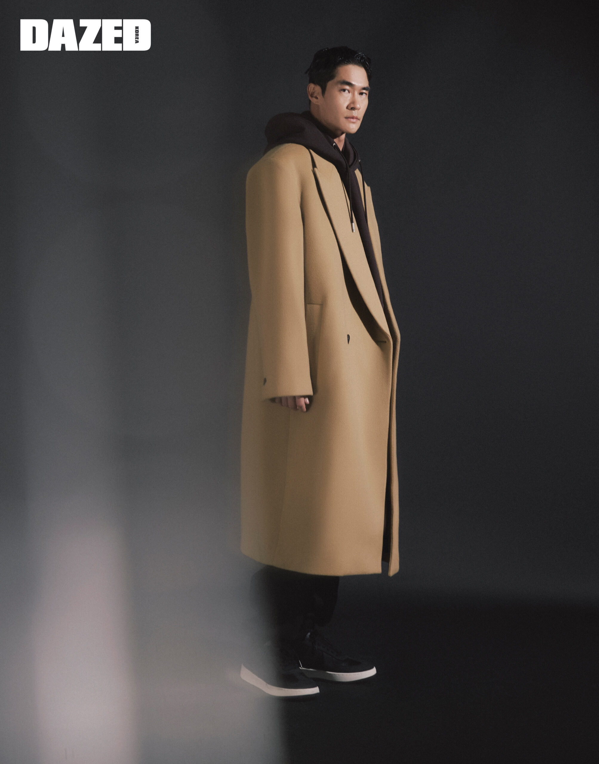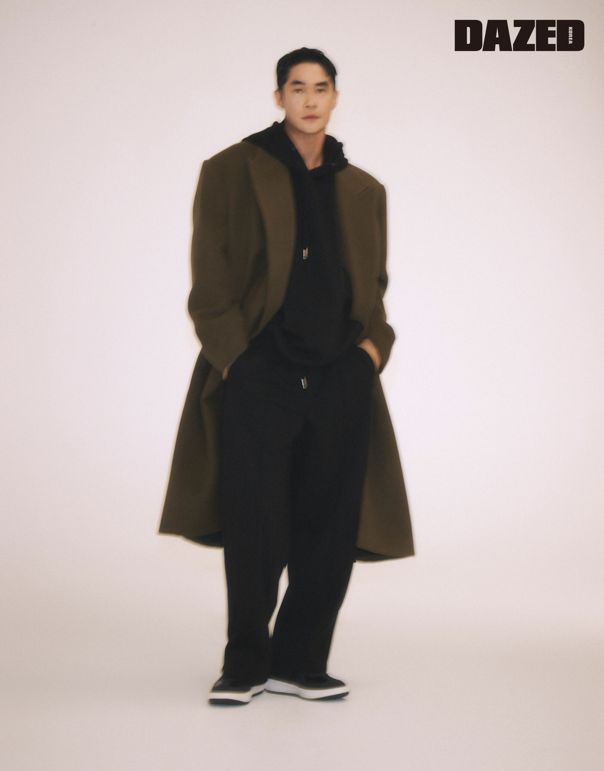 캐멀 컬러 더블 코트와 블랙 후디, 와이드 트레이닝 팬츠, 고스트 스니커즈는 모두 송지오×배정남 아뜰리에 컬렉션(SONGZIO×BAE Atelier Collection).