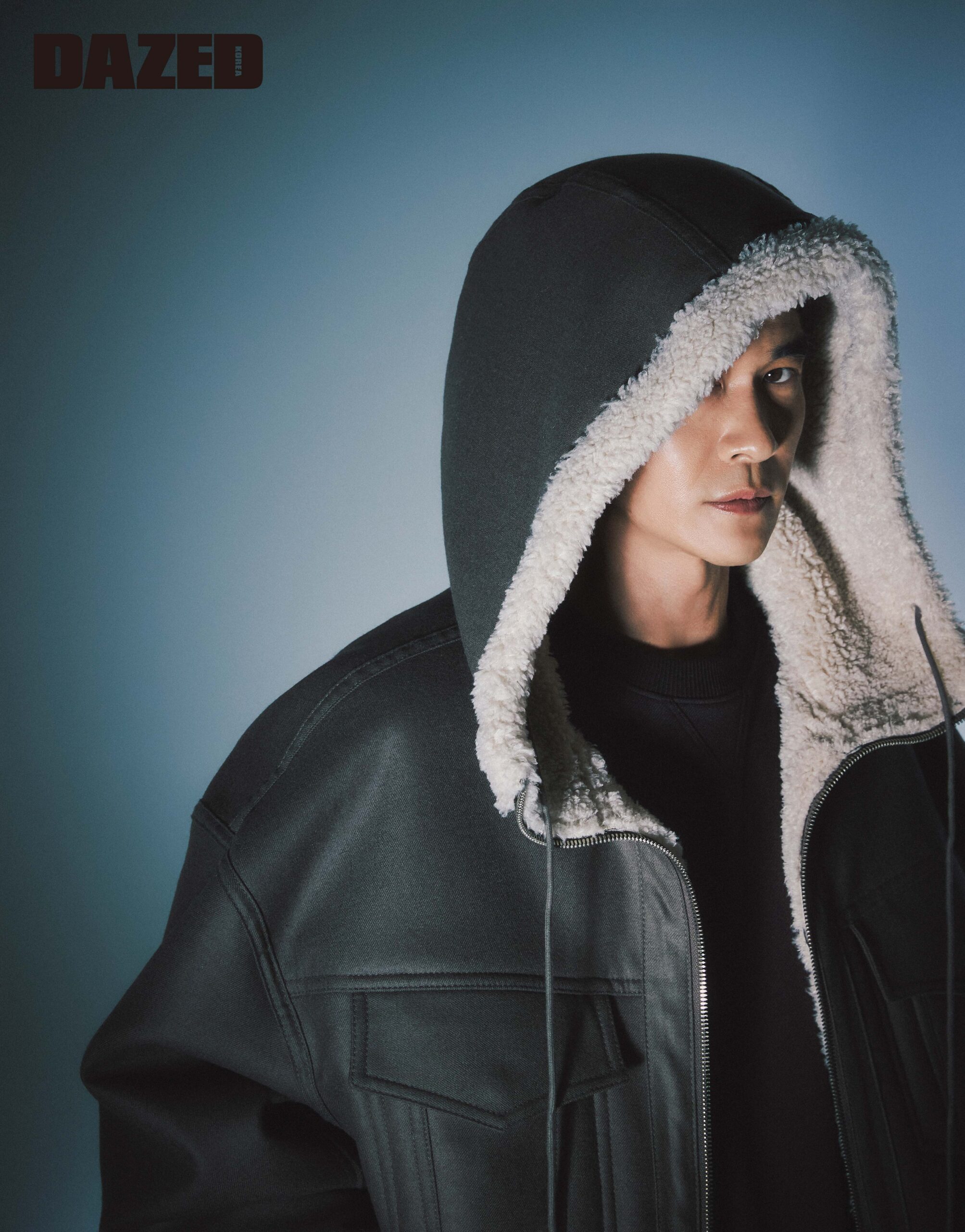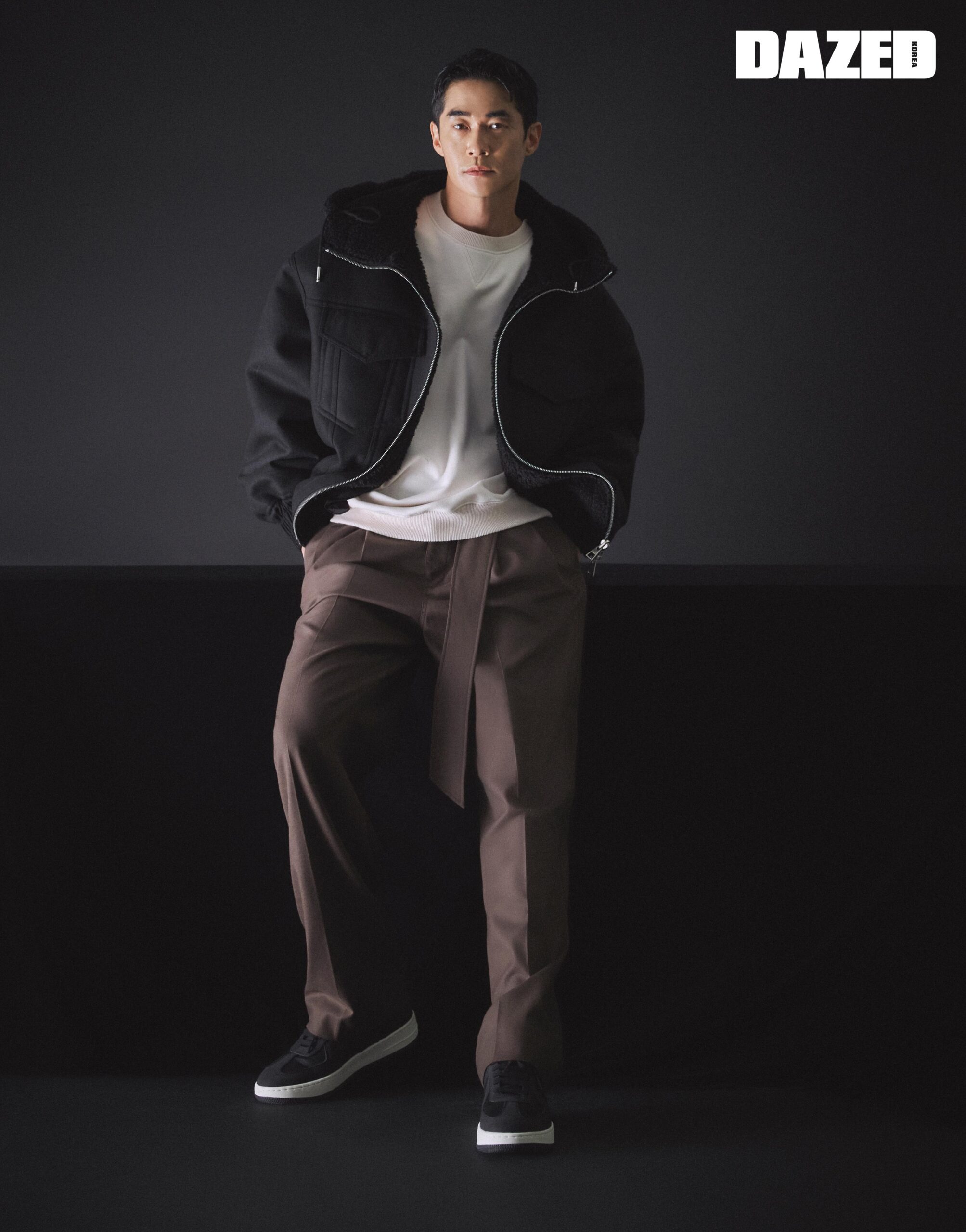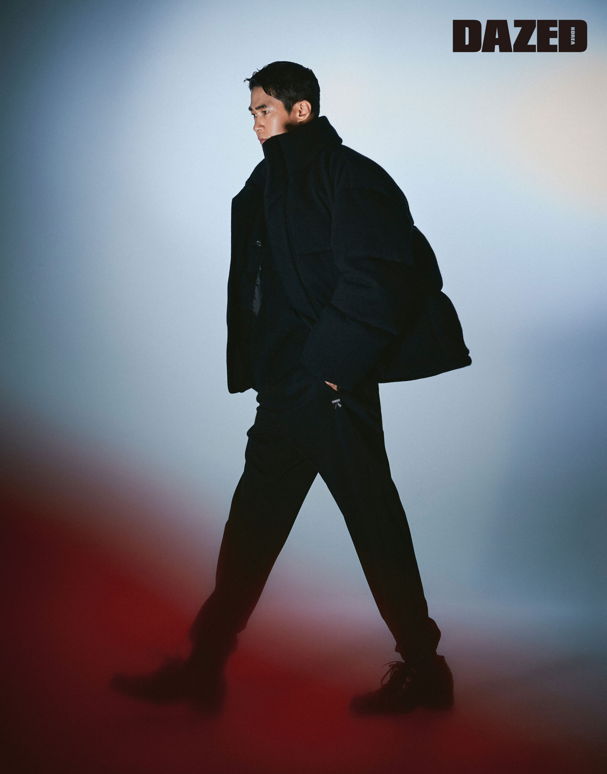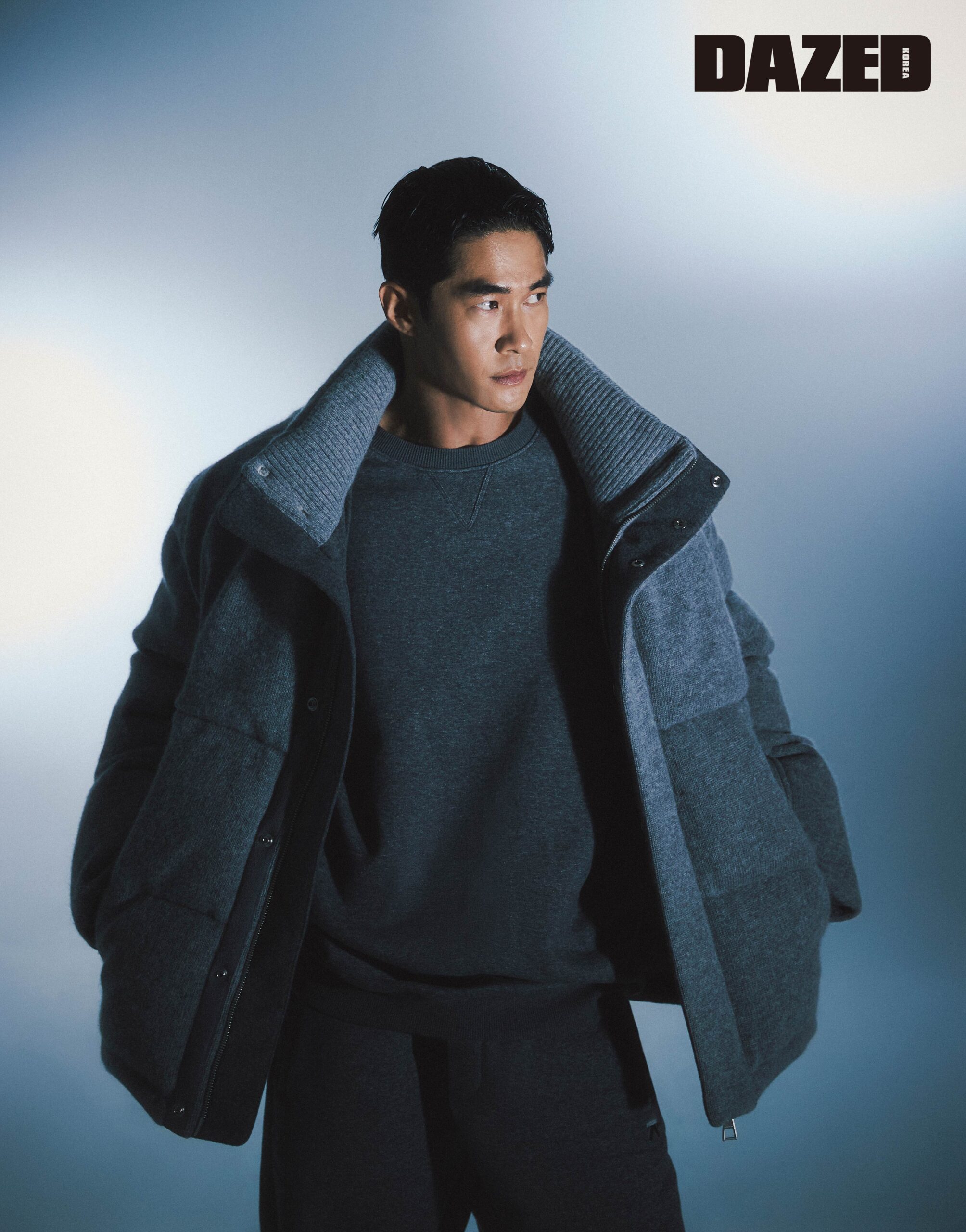 알파카 다운 재킷과 스웨트셔츠, 조거 팬츠는 모두 송지오×배정남 아뜰리에 컬렉션(SONGZIO×BAE Atelier Collection), 마운틴 스니커즈는 송지오(Songzio).