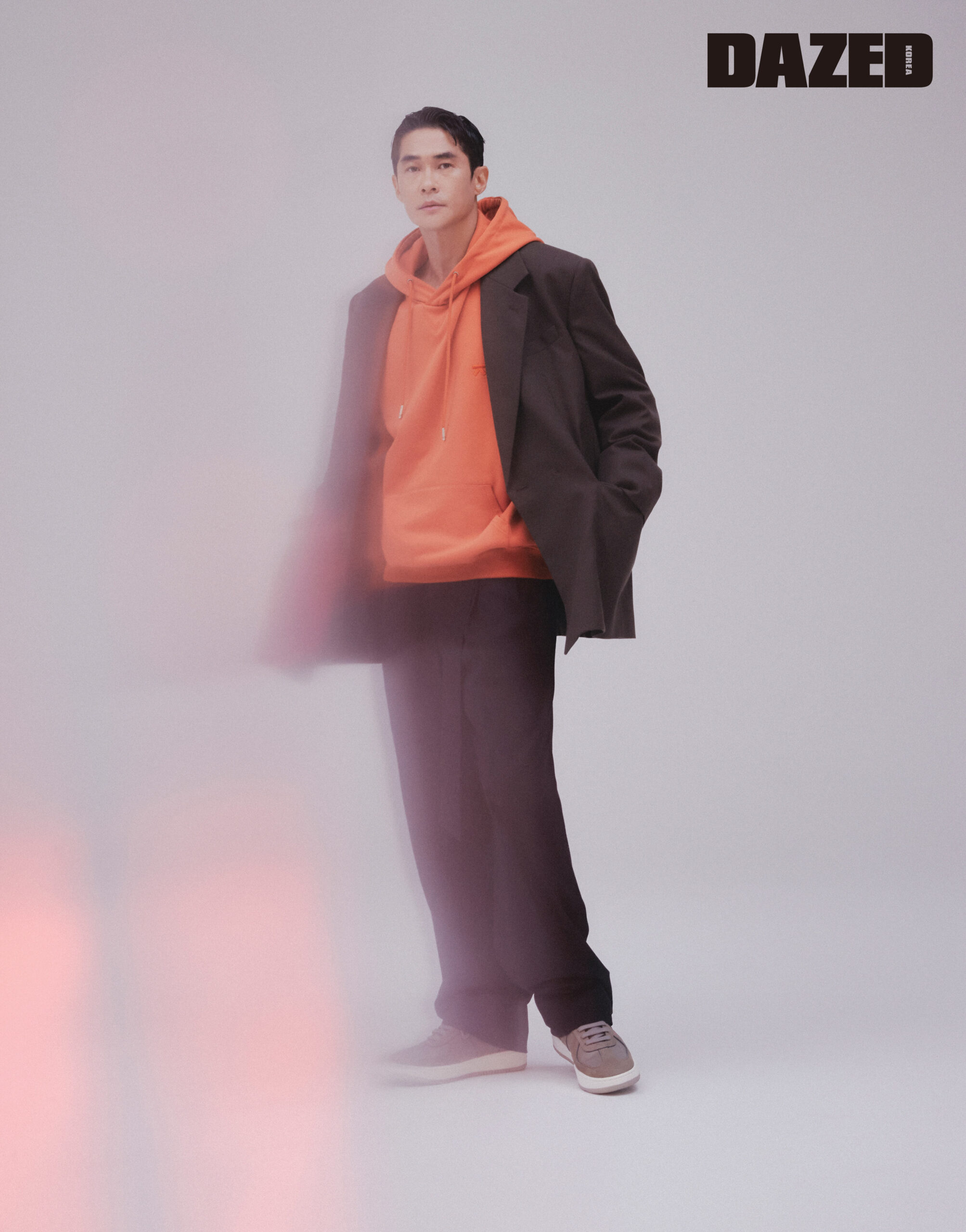 브라운 더블 재킷과 오렌지 후디, 와이드 벨트 팬츠, 고스트 스니커즈는 모두 송지오×배정남 아뜰리에 컬렉션(SONGZIO×BAE Atelier Collection).