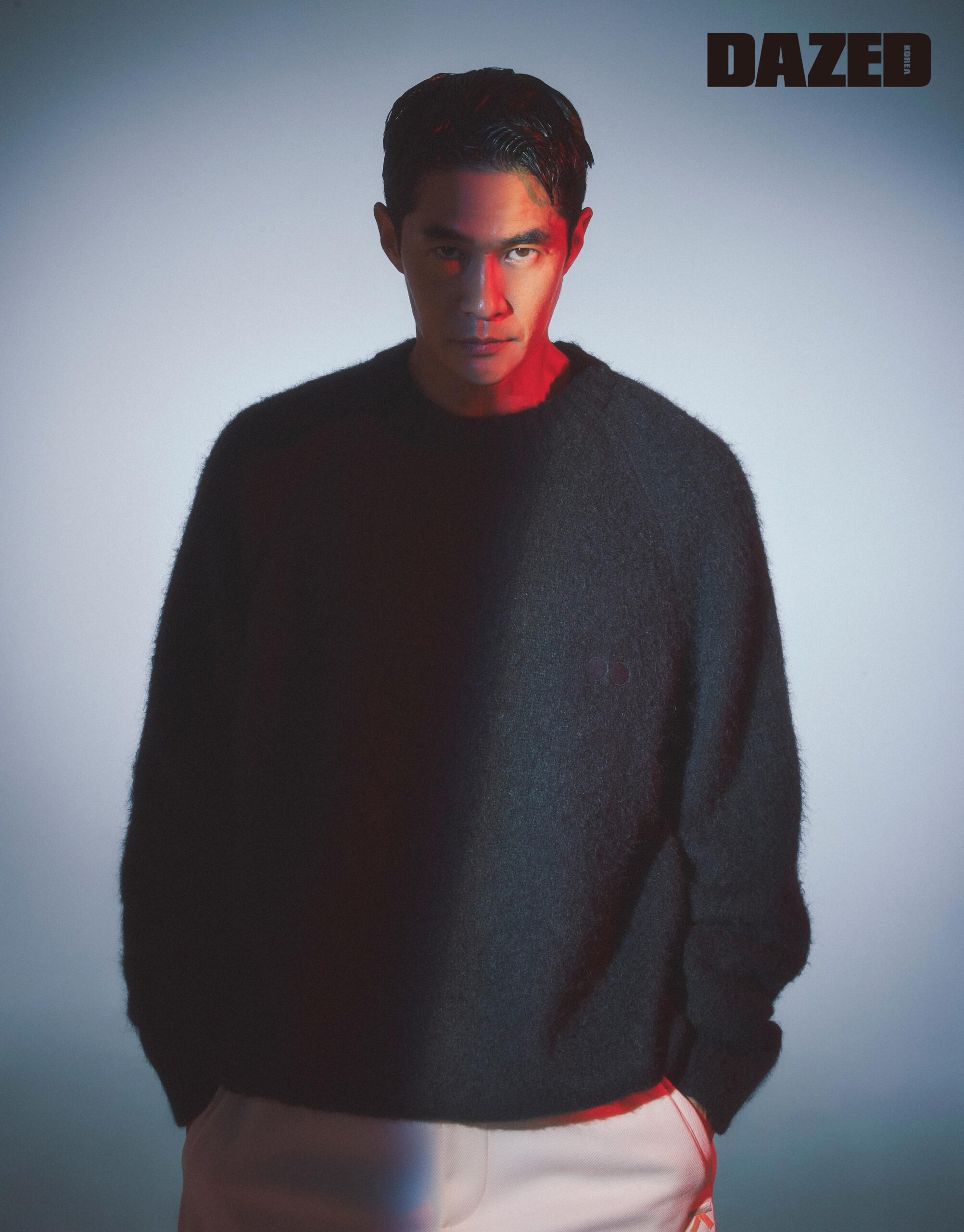 리버서블 뉴 코쿤 울 재킷과 스웨트셔츠, 와이드 벨트 팬츠, 고스트 스니커즈는 모두 송지오×배정남 아뜰리에 컬렉션(SONGZIO×BAE Atelier Collection).