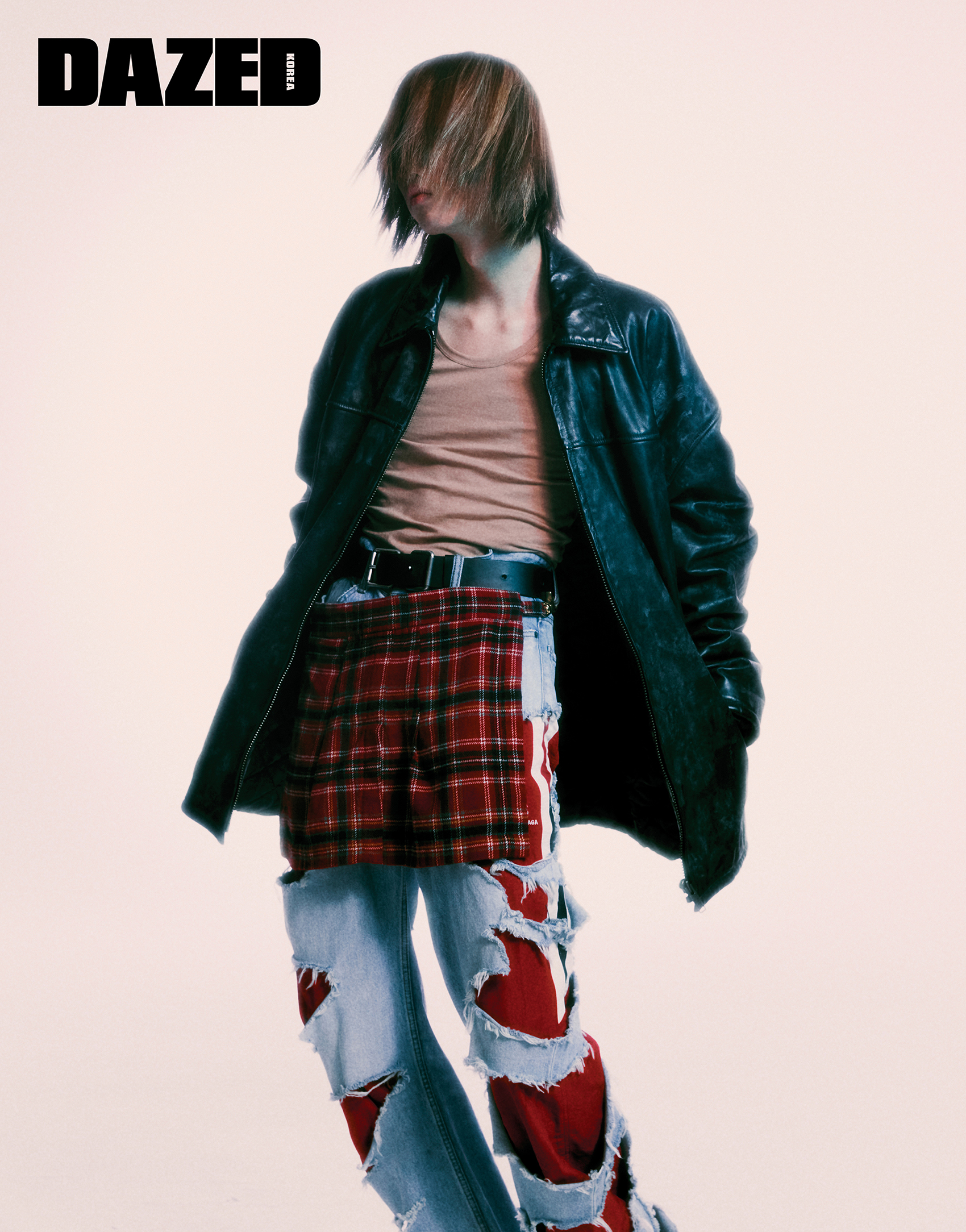 레더 재킷과 슬리브리스 톱, 트레이닝복을 레이어링한 데님 팬츠는 모두 발렌시아가(Balenciaga), 스커트는 스타일리스의 것.