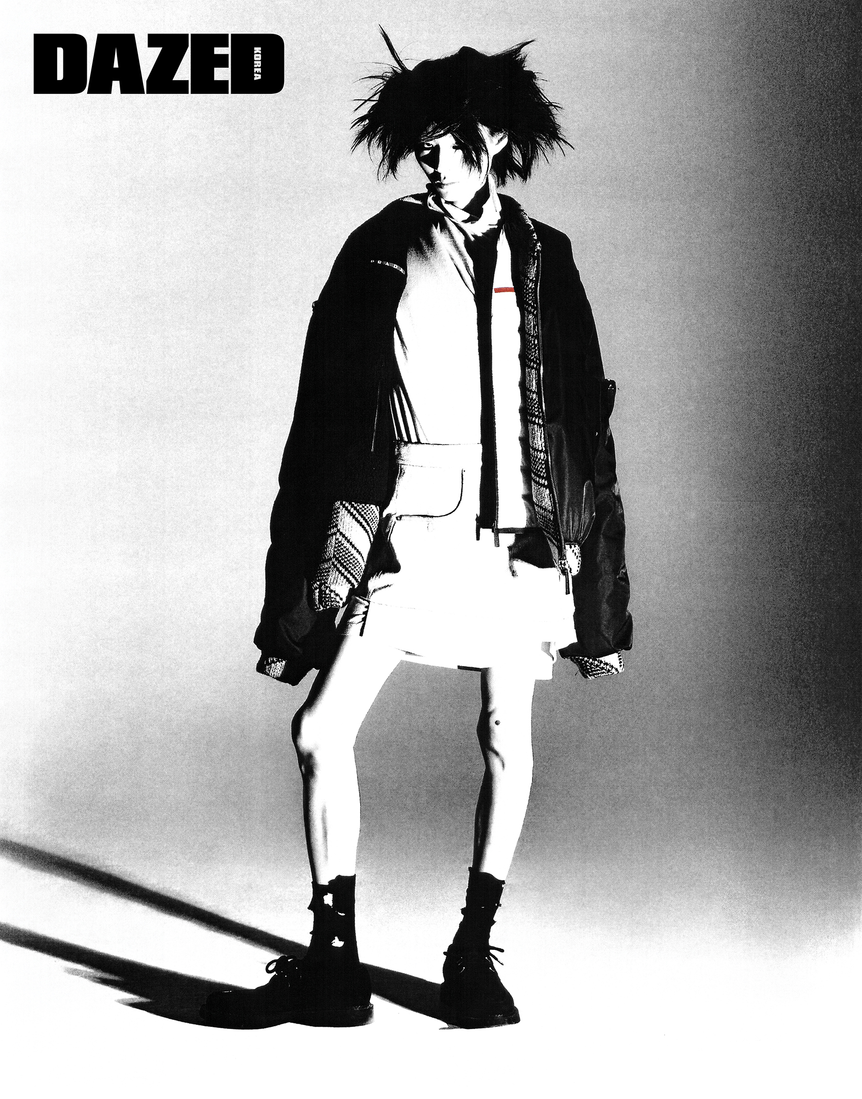 오버사이즈 보머 재킷과 패딩 베스트는 프라다(Prada), 이너 톱과 레이어링한 데님 스커트는 릭 오웬스(Rick Owens), 클리퍼는 생 로랑 by 안토니 바카렐로(Saint Laurent by Anthony Vaccarello), 양말의 스타일리스트의 것.