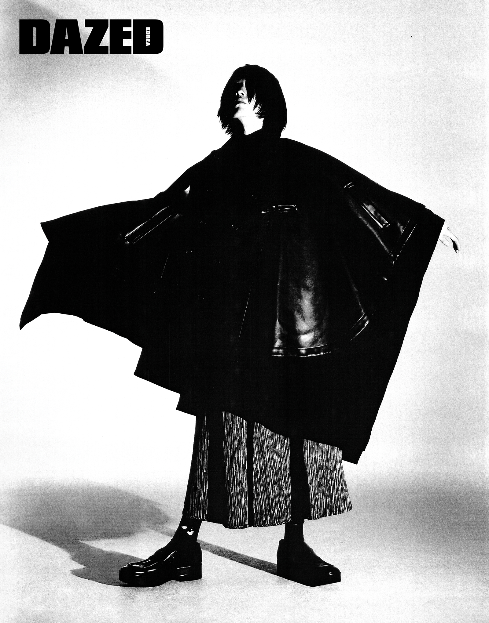 케이프는 꼼데가르송 옴므 플러스(Comme des Garçons Homme Plus), 롱스커트는 네임세이크(Namesake), 로퍼는 프라다(Prada), 양말의 스타일리스트의 것.